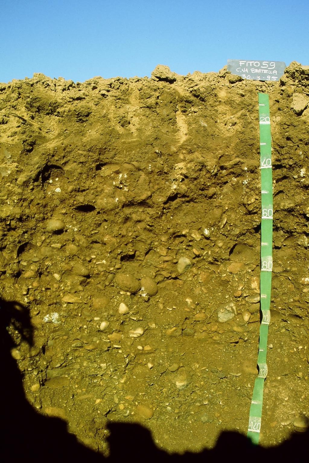 Orizzonte BC : 35 - 80 cm; umido; colore bruno (7,5YR 4/4); tessitura franco sabbiosa; scheletro 60 % , di forma subarrotondata con diametro medio di 100 mm e diametro massimo di 200 mm, leggermente alterato; non calcareo; pellicole primarie di argilla 2 %, presenti n.i.