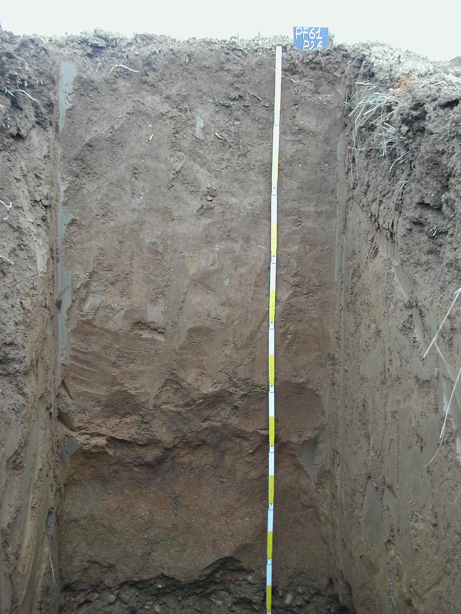 Orizzonte Bw2 : 80 - 110 cm; umido; colore bruno giallastro scuro (10YR 4/6); tipo colore ossidato; tessitura franco sabbiosa; scheletro 0 % , di forma n.i.; struttura poliedrica subangolare media di grado debole; macropori < 0,1 % con dimensioni medie 1-5 mm; radici 1/dmq, con dimensioni medie di 1 mm e dimensioni massime di 1 mm, orientamento nessuno; radicabilità 80 % ; resistenza: debole; cementazione molto debole; debolmente adesivo; non plastico; non calcareo; pellicole primarie : ponti di argilla (tra i granuli di sabbia) 1 %, presenti nella matrice; limite inferiore graduale.