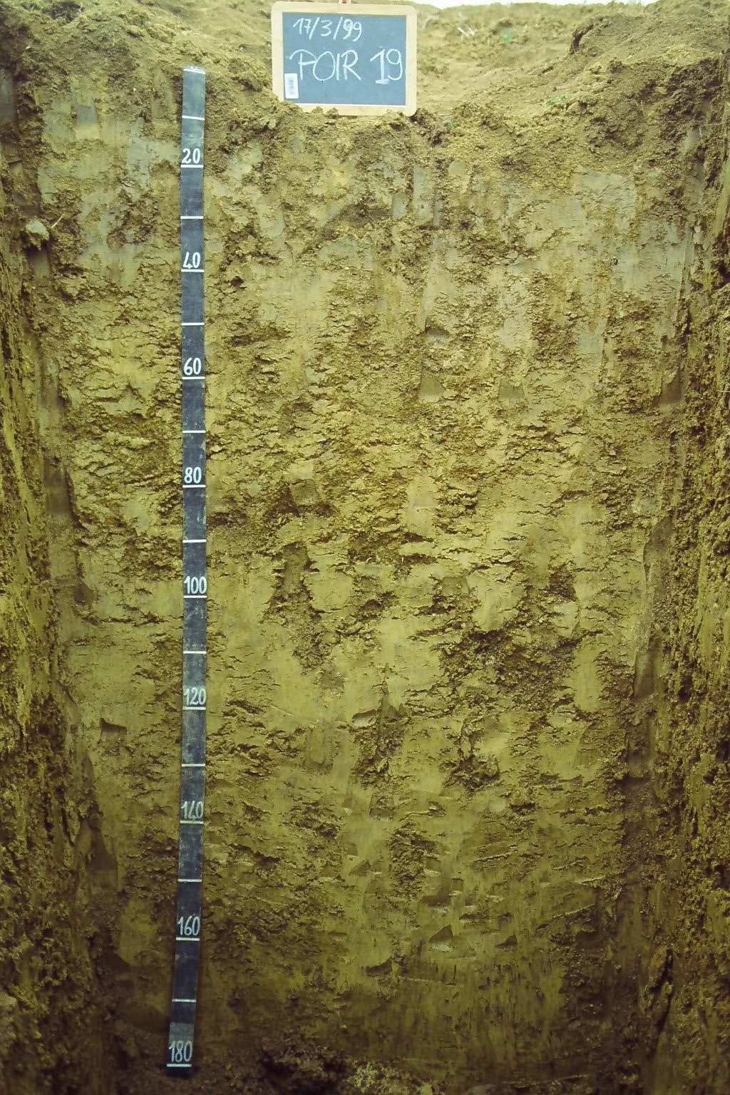Orizzonte Bsst : 90 - 140 cm; umido; colore bruno olivastro chiaro (2,5Y 5/6); screziature 10 %, con dimensioni medie di 2 mm, con limite diffuso, dominanti di colore giallo olivastro (2,5Y 6/6), secondarie di colore bruno intenso (7,5YR 5/8); tessitura argillosa; scheletro 0 % , di forma n.i.; struttura poliedrica angolare fine di grado moderato; macropori < 0,1 % con dimensioni medie <1 mm; radici 0/dmq, con dimensioni medie di mm , orientamento n.i.; resistenza: estremamente resistente; cementazione molto forte; molto adesivo; molto plastico; non calcareo; noduli di ferro-manganese 2 %, 1 mm, presenti nella matrice; pellicole primarie orientate per pressione 5 %, presenti nella matrice, pellicole secondarie di argilla 30 %, presenti nella matrice; limite inferiore abrupto.