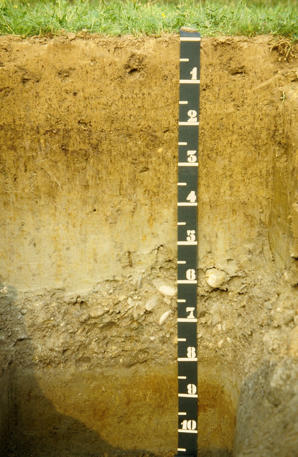 Orizzonte B : 30 - 45 cm; umido; colore bruno grigiastro scuro (10YR 4/2); screziature 10 %, con dimensioni medie di 3 mm, con limite netto, dominanti di colore bruno intenso (7,5YR 5/6); tessitura franco sabbiosa; scheletro 8 % , di forma arrotondata con diametro medio di 25 mm; struttura poliedrica subangolare grossolana di grado incoerente; macropori 0,1-0,4 % con dimensioni medie 1-5 mm; radici 17/dmq, con dimensioni medie di 2 mm , orientamento n.i.; resistenza: debole; cementazione forte; debolmente adesivo; debolmente plastico; non calcareo; concrezioni di ferro-manganese 1 %, mm, presenti n.i.; limite inferiore graduale.