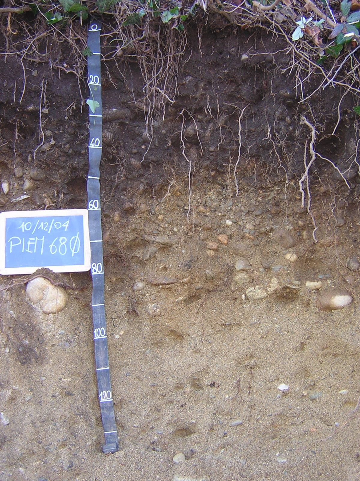 Orizzonte C1 : 50 - 65 cm; umido; colore giallo brunastro (10YR 6/6); tipo colore ossidato; tessitura sabbiosa; scheletro 50 % , di forma subarrotondata con diametro medio di 30 mm e diametro massimo di 50 mm, non alterato; radici 2/dmq, con dimensioni medie di 1 mm e dimensioni massime di 2 mm, orientamento obliquo; radicabilità 20 % ; resistenza: incoerente; cementazione molto debole; non adesivo; non plastico; non calcareo; limite inferiore chiaro.