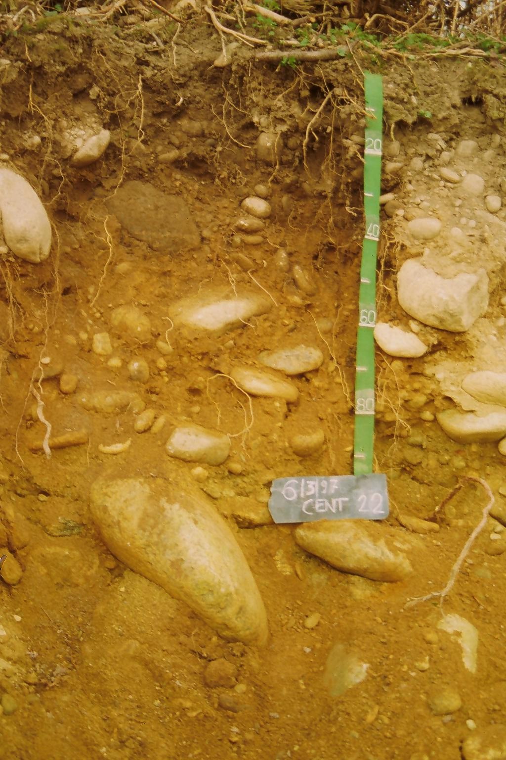 Orizzonte Bw : 30 - 100 cm; colore bruno giallastro (10YR 5/8); tessitura sabbioso franca; scheletro 50 % , di forma subarrotondata con diametro medio di 300 mm e diametro massimo di 600 mm, non alterato; non calcareo; limite inferiore non raggiuto.