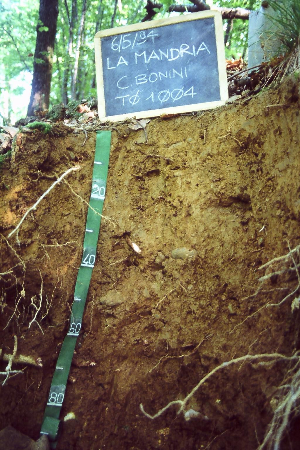 Orizzonte Bt : 60 - 80 cm; umido; colore bruno (7,5YR 4/4); colore subordinato bruno giallastro scuro (10YR 4/6); tessitura franco limoso argillosa; scheletro 15 % , di forma subarrotondata con diametro medio di 150 mm e diametro massimo di 200 mm; struttura poliedrica subangolare grossolana di grado moderato; radici 5/dmq, con dimensioni medie di 10 mm , orientamento n.i.; non calcareo; noduli di ferro-manganese 5 %, 5 mm, presenti n.i.; pellicole primarie di argilla 10 %, presenti n.i.; limite inferiore non raggiuto.