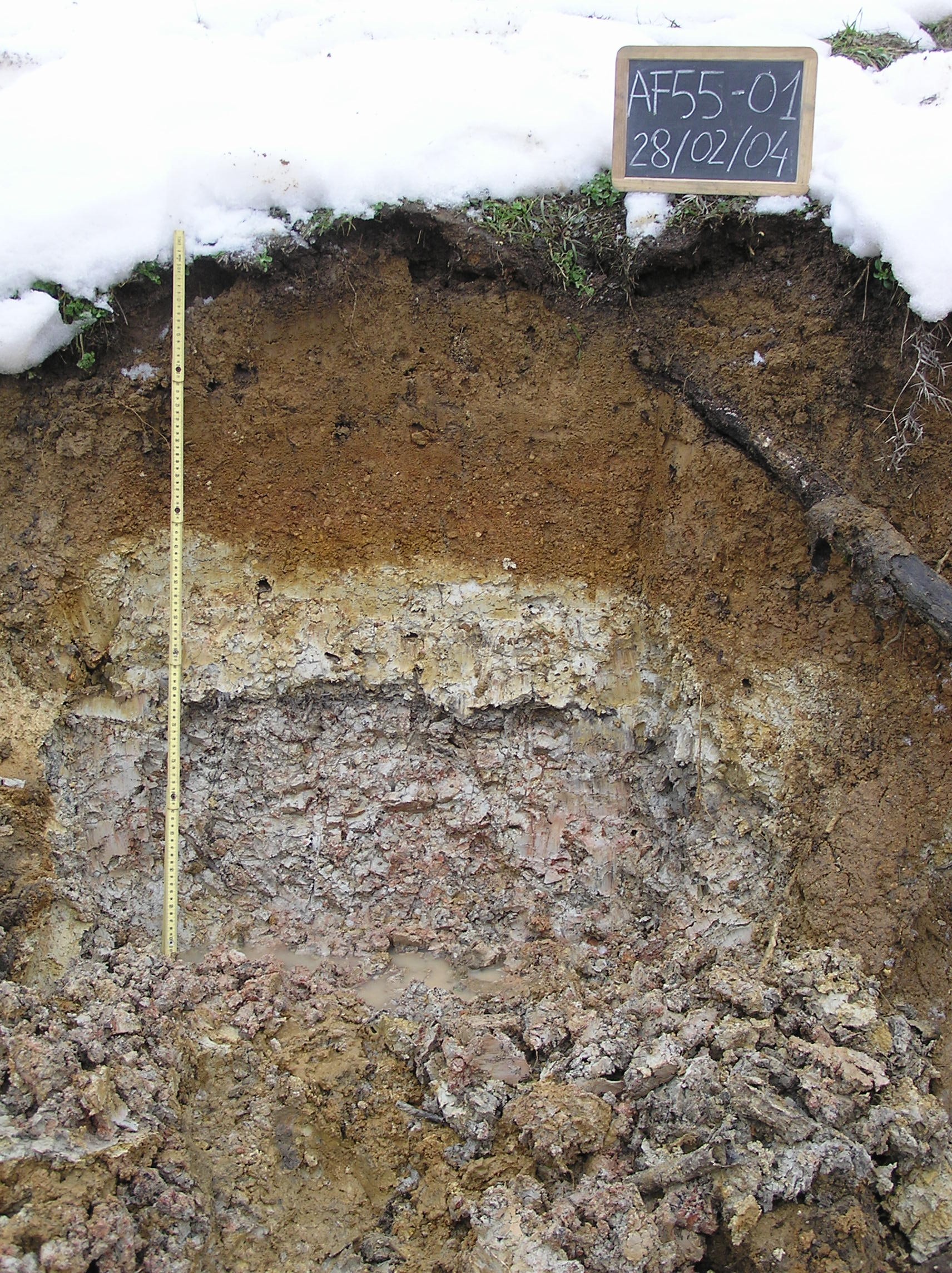 Orizzonte 2C2 : 72 - 101 cm; bagnato; colore grigio chiaro (10YR 7/1); colore subordinato bruno rossatro (2,5YR 4/4); tipo colore litocromico; tessitura franco limoso argillosa; scheletro 2 % , di forma subarrotondata con diametro medio di 30 mm e diametro massimo di 50 mm, alterato; macropori < 0,1 % con dimensioni medie <1 mm; radici 3/dmq, con dimensioni medie di 1 mm e dimensioni massime di 2 mm, orientamento orizzontale; radicabilità 80 % ; resistenza: molto resistente; moderatamente adesivo; moderatamente plastico; non calcareo; limite inferiore non raggiuto.