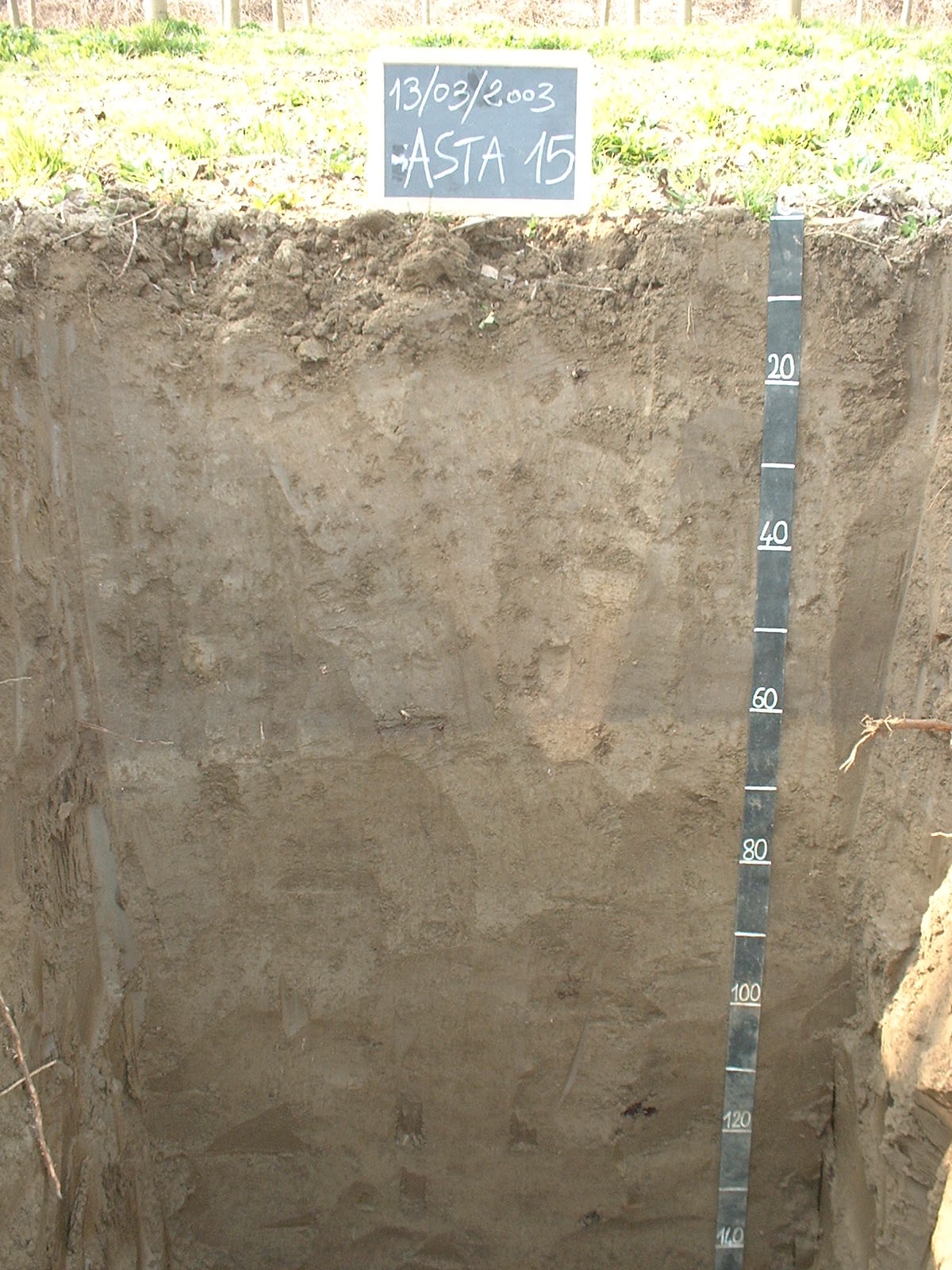 Orizzonte C : 60 - 90 cm; umido; colore bruno olivastro chiaro (2,5Y 5/3); screziature 30 %, con dimensioni medie di 10 mm, con limite diffuso, dominanti di colore bruno grigiastro scuro (2,5Y 4/2); tessitura franco sabbiosa; scheletro 0 % , di forma n.i.; struttura poliedrica subangolare media di grado debole; macropori < 0,1 % con dimensioni medie 1-5 mm; radici 2/dmq, con dimensioni medie di 2 mm e dimensioni massime di 8 mm, orientamento orizzontale; radicabilità 70 % ; resistenza: debole; cementazione molto debole; non adesivo; non plastico; molto fortemente calcareo; limite inferiore abrupto.