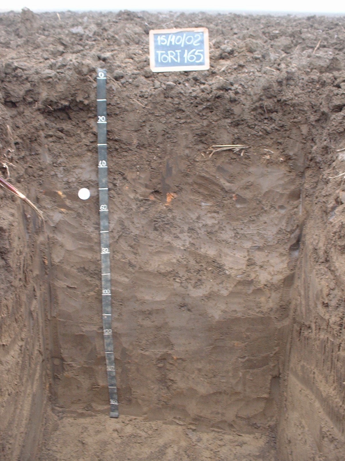 Orizzonte Bw1 : 55 - 70 cm; umido; colore bruno grigiastro scuro (2,5Y 4/2); colore delle facce bruno olivastro (2,5Y 4/3); tipo colore ossidato; tessitura franco argillosa; scheletro 0 % , di forma n.i.; struttura poliedrica angolare media di grado forte; fessure profonde che attraversano più orizzonti, reversibili con dimensioni medie di 1 mm; macropori 0,1-0,4 % con dimensioni medie <1 mm; radici 1/dmq, con dimensioni medie di 1 mm e dimensioni massime di 2 mm, orientamento verticale; radicabilità 80 % ; resistenza: estremamente resistente; cementazione debole; molto adesivo; molto plastico; calcareo; pellicole primarie orientate per pressione 3 %, presenti sulle facce degli aggregati; limite inferiore chiaro.