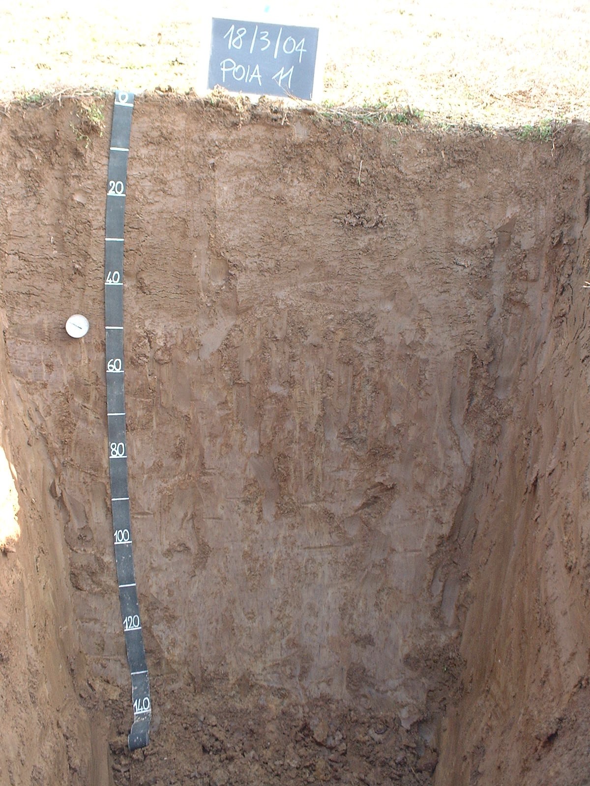 Orizzonte Ap : 0 - 40 cm; umido; colore bruno (10YR 4/3); tipo colore ossidato; tessitura franca; scheletro 0 % , di forma n.i.; macropori < 0,1 % con dimensioni medie <1 mm; radici 45/dmq, con dimensioni medie di 1 mm e dimensioni massime di 3 mm, orientamento obliquo; radicabilità 90 % ; resistenza: debole; cementazione molto debole; debolmente adesivo; debolmente plastico; non calcareo; limite inferiore chiaro.