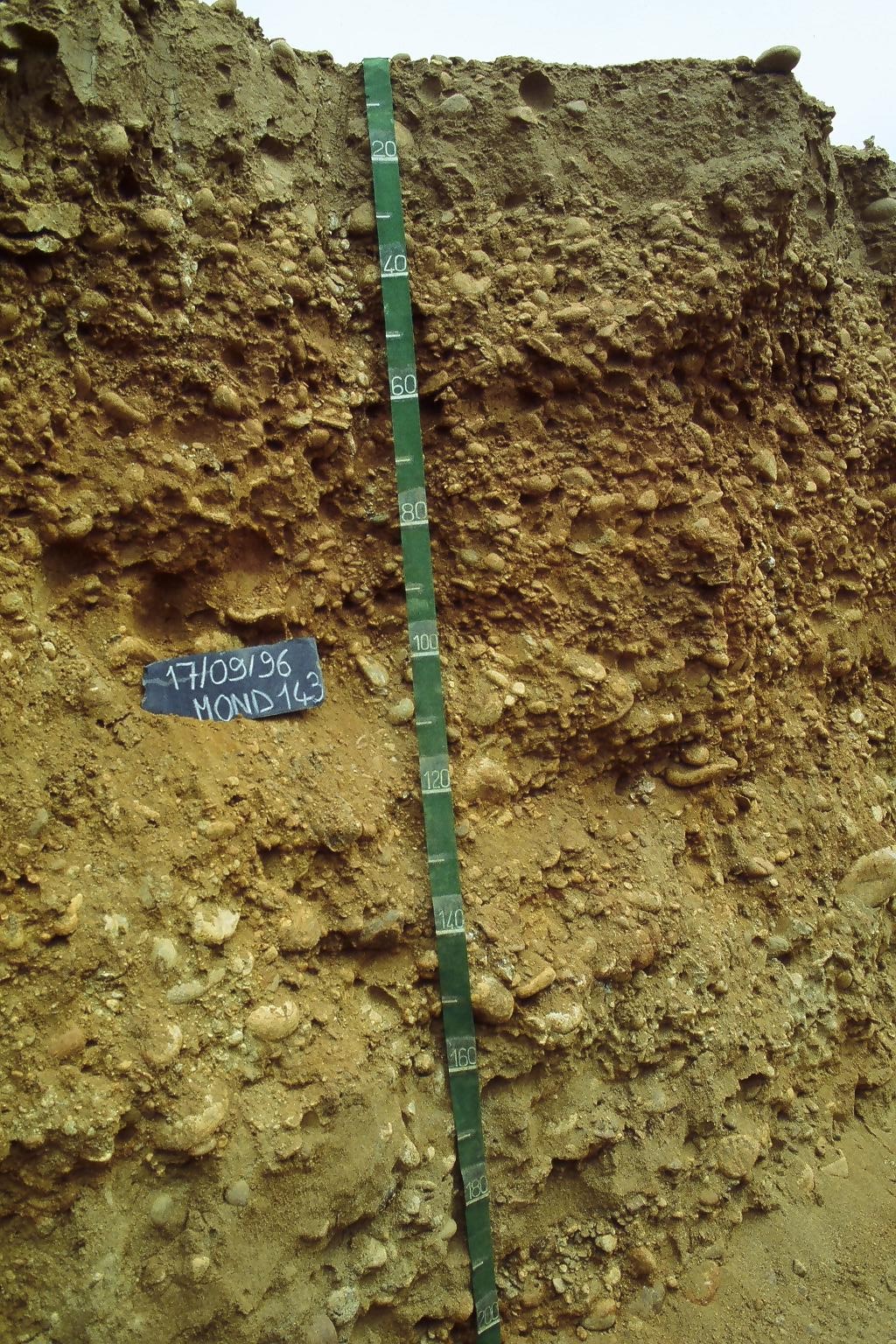 Orizzonte Bt3 : 140 - 200 cm; colore bruno giallastro scuro (10YR 4/4); tessitura sabbioso franca; scheletro 75 % , di forma subarrotondata con diametro medio di 250 mm e diametro massimo di 500 mm, fortemente alterato; non calcareo; pellicole primarie di argilla 2 %, presenti n.i.