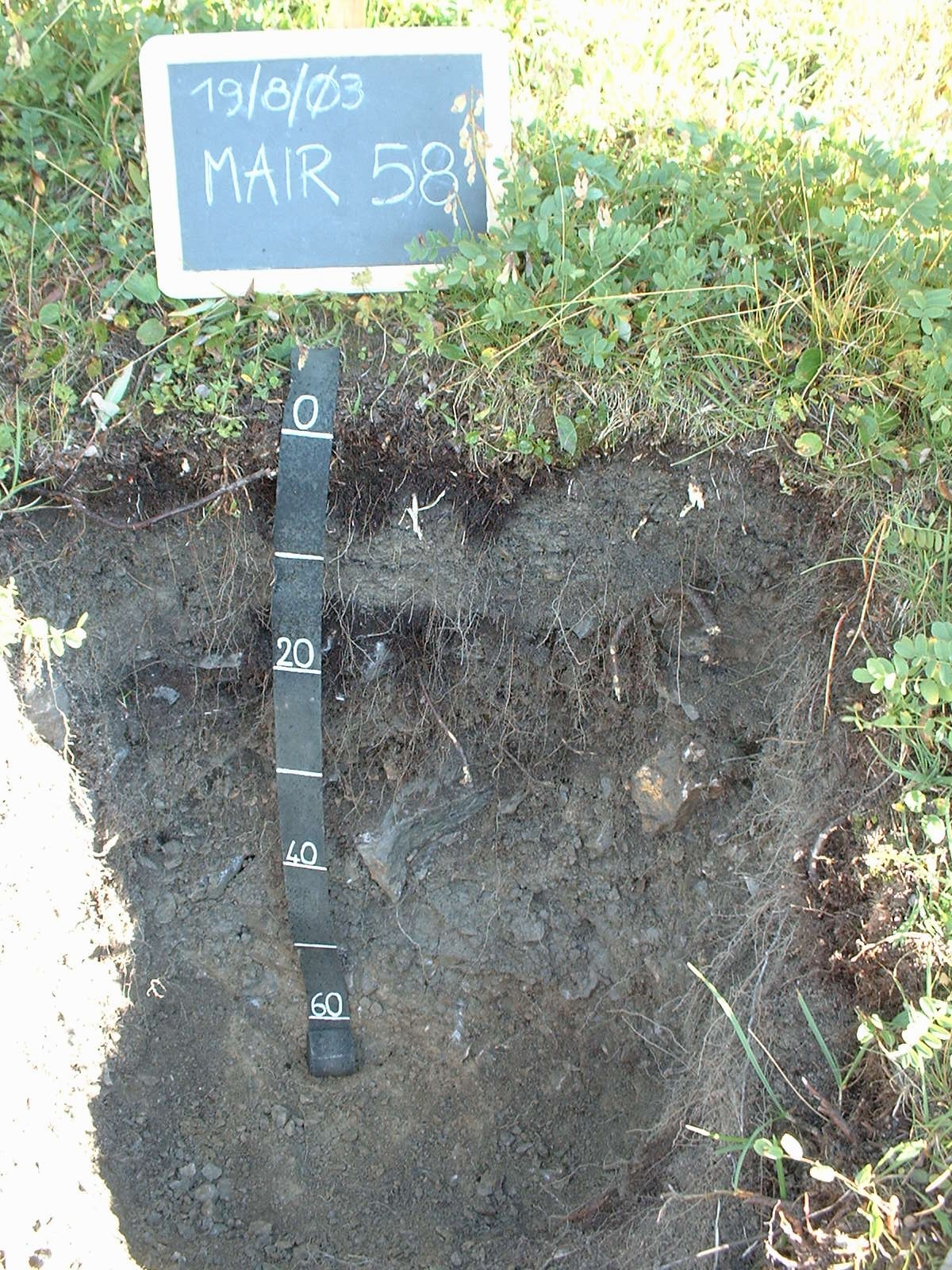 Orizzonte Ah : 0 - 5 cm; umido; colore nero (5YR 2/1); tipo colore ossidato; tessitura franca; scheletro 10 % , di forma angolare con diametro medio di 30 mm e diametro massimo di 100 mm, non alterato; radici 60/dmq, con dimensioni medie di 1 mm e dimensioni massime di 4 mm, orientamento n.i.; radicabilità 80 % ; resistenza: incoerente; cementazione molto debole; non adesivo; non plastico; non calcareo; limite inferiore chiaro.