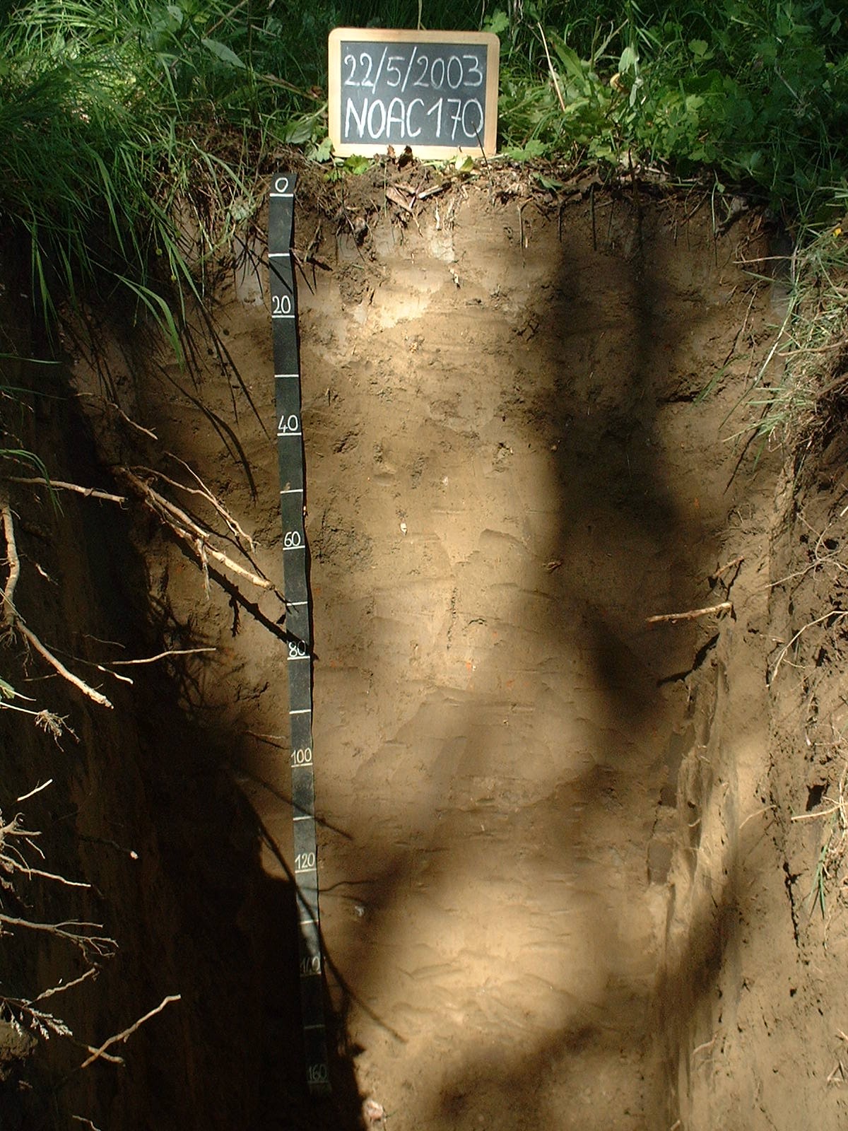 Orizzonte C : 130 - 150 cm; umido; colore bruno olivastro (2,5Y 4/4); colore subordinato bruno giallastro scuro (10YR 4/4); tipo colore ossidato; tessitura franca; scheletro 1 % , di forma subarrotondata con diametro medio di 15 mm e diametro massimo di 30 mm, leggermente alterato; macropori 0,1-0,4 % con dimensioni medie 1-5 mm; radici 2/dmq, con dimensioni medie di 2 mm e dimensioni massime di 3 mm, orientamento nessuno; radicabilità 60 % ; resistenza: debole; cementazione molto debole; non adesivo; debolmente calcareo; limite inferiore non raggiuto.