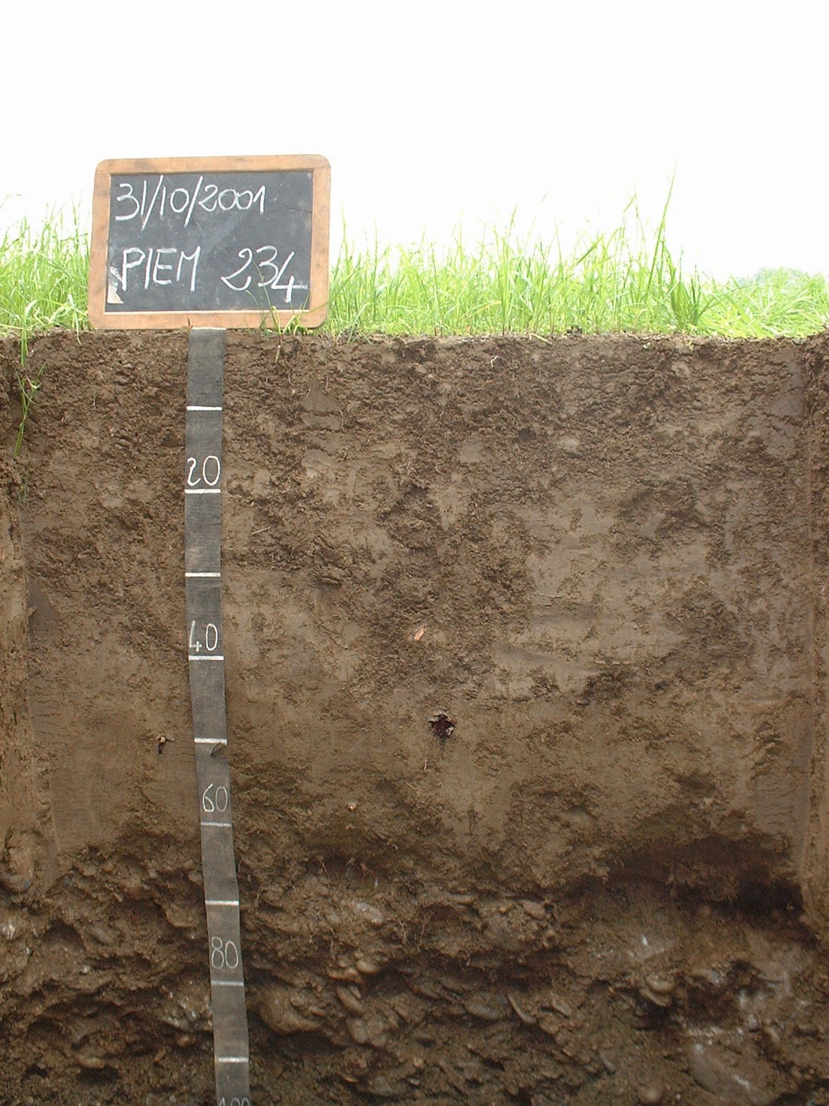 Orizzonte C : 50 - 60 cm; umido; colore giallo olivastro (2,5Y 6/6); tipo colore litocromico; tessitura sabbioso franca; scheletro 40 % , di forma n.i.; radicabilità 40 % ; resistenza: incoerente; cementazione molto debole; non adesivo; non plastico; non calcareo.