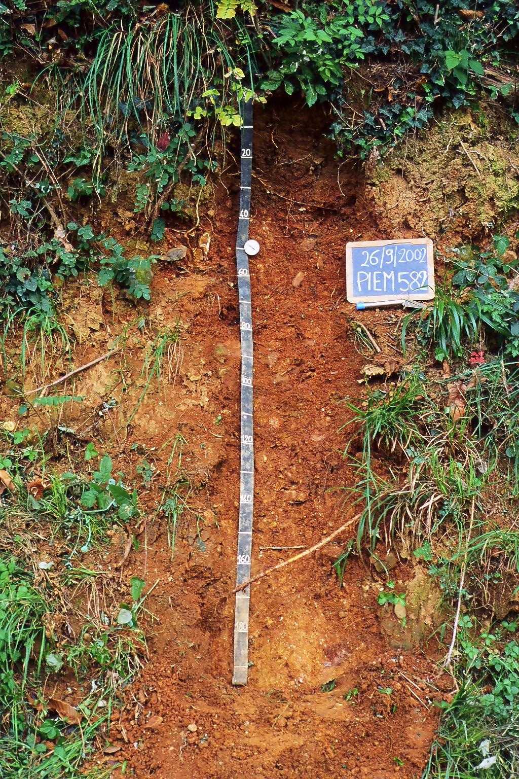 Orizzonte Bt2 : 70 - 130 cm; umido; colore bruno (7,5YR 5/4); colore subordinato bruno intenso (7,5YR 5/6); tipo colore ossidato; tessitura franco sabbioso argillosa; scheletro 30 % , di forma irregolare con diametro medio di 50 mm e diametro massimo di 80 mm, leggermente alterato; struttura poliedrica angolare media di grado forte; radicabilità 40 % ; resistenza: debole; cementazione molto debole; moderatamente adesivo; moderatamente plastico; non calcareo; pellicole primarie di argilla 25 %, presenti sulle facce degli aggregati.