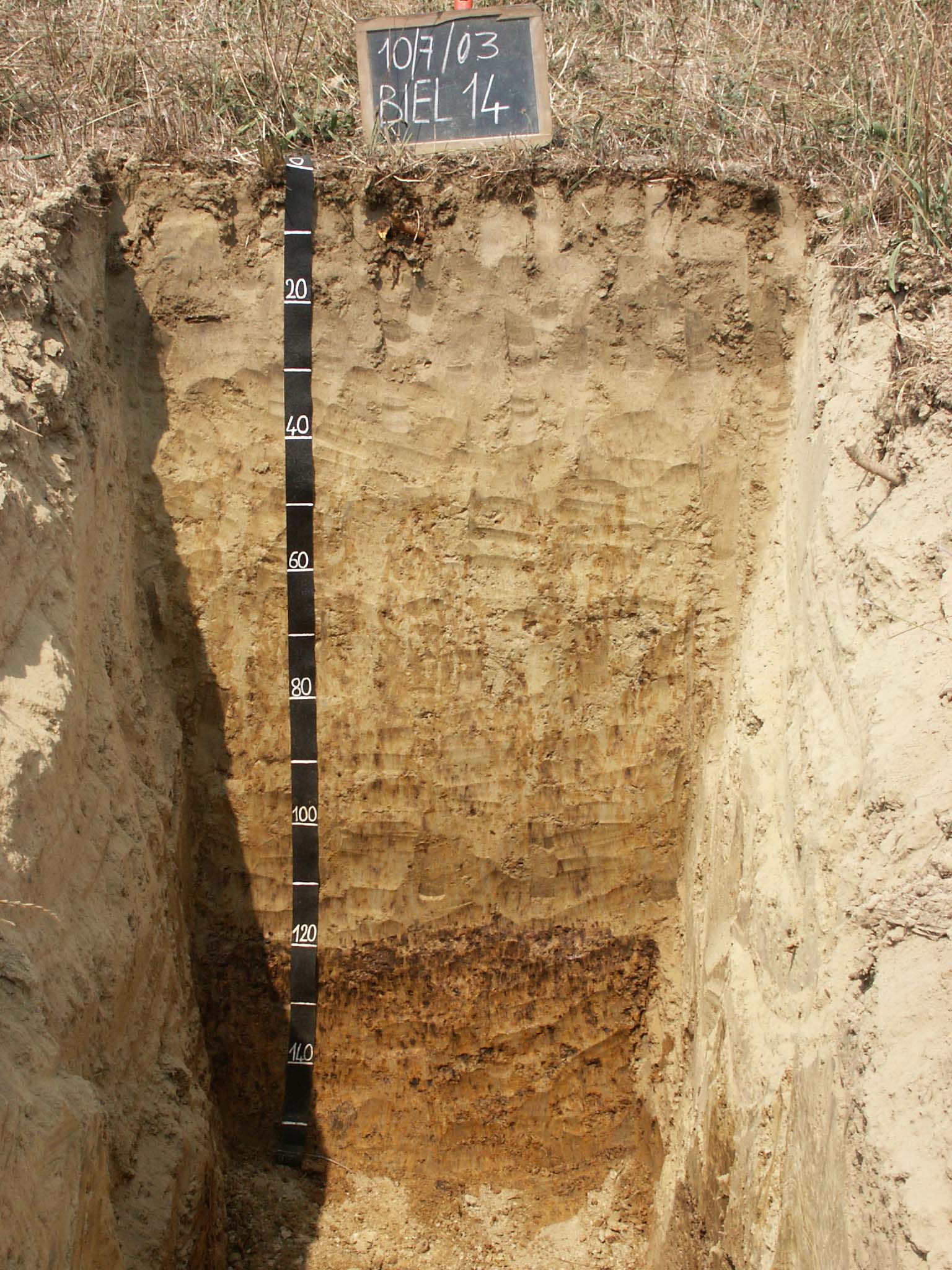 Orizzonte EB : 45 - 80 cm; secco; colore bruno giallastro scuro (10YR 4/6); colore subordinato bruno giallastro chiaro (2,5Y 6/4); tipo colore variegato; screziature 40 %, con dimensioni medie di 5 mm, con limite netto, dominanti di colore grigio chiaro (2,5Y 7/2); tessitura franco argillosa; scheletro 0 % , di forma n.i.; struttura poliedrica angolare fine di grado moderato; macropori < 0,1 % con dimensioni medie 1-5 mm; radici 3/dmq, con dimensioni medie di 1 mm e dimensioni massime di 1 mm, orientamento orizzontale; radicabilità 50 % ; resistenza: estremamente resistente; cementazione debole; moderatamente adesivo; moderatamente plastico; non calcareo; noduli di ferro-manganese 2 %, 5 mm, presenti nella matrice; masse di ferro-manganese 2 %, 2 mm, presenti nella matrice; pellicole primarie di argilla 3 %, presenti sulle facce degli aggregati; limite inferiore chiaro.