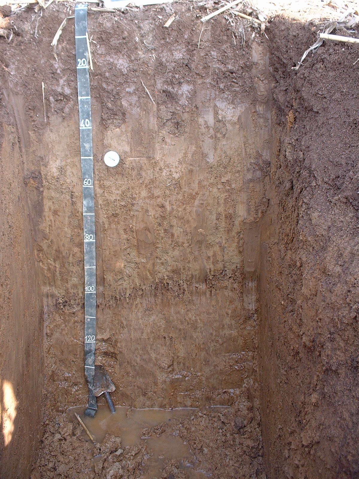 Orizzonte Bt : 110 - 160 cm; umido; colore bruno olivastro chiaro (2,5Y 5/4); colore subordinato bruno giallastro scuro (10YR 4/4); tipo colore variegato; screziature 20 %, con dimensioni medie di 5 mm, con limite netto, dominanti di colore bruno intenso (7,5YR 4/6), secondarie di colore nero (10YR 2/1); tessitura franco limosa; scheletro 0 % , di forma n.i.; struttura poliedrica subangolare grossolana di grado forte; macropori < 0,1 % con dimensioni medie <1 mm; radicabilità 20 % ; resistenza: moderatamente resistente; cementazione molto debole; debolmente adesivo; moderatamente plastico; non calcareo; noduli di ferro-manganese 2 %, 5 mm, presenti nella matrice; masse di ferro-manganese 2 %, 2 mm, presenti nella matrice; pellicole primarie ferromanganesifere 4 %, presenti sulle facce degli aggregati, pellicole secondarie di argilla 10 %, presenti sulle facce degli aggregati; limite inferiore non raggiuto.