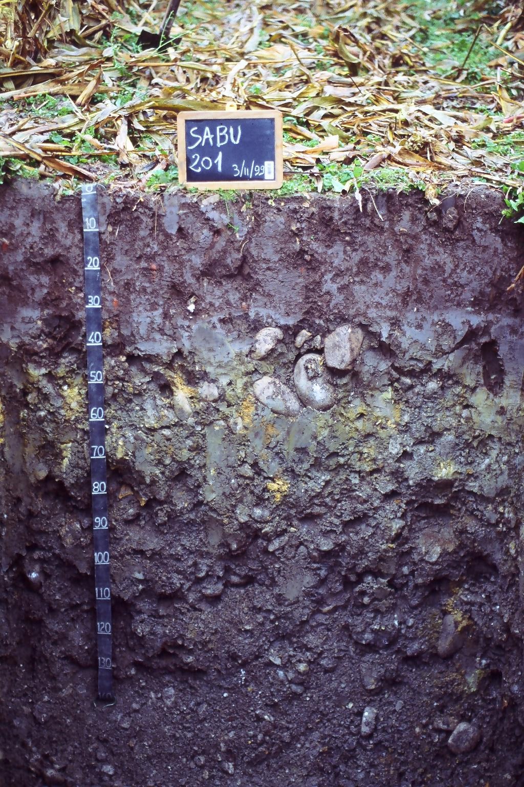 Orizzonte Cg1 : 30 - 75 cm; umido; colore grigio olivastro (5Y 5/2); colore subordinato grigio olivastro (5Y 4/2); tipo colore variegato; screziature 15 %, con dimensioni medie di 20 mm, con limite chiaro, dominanti di colore giallo olivastro (2,5Y 6/8); tessitura franca; scheletro 40 % , di forma subarrotondata con diametro medio di 40 mm e diametro massimo di 120 mm, leggermente alterato; macropori < 0,1 % con dimensioni medie <1 mm; radici 2/dmq, con dimensioni medie di 1 mm e dimensioni massime di 1 mm, orientamento obliquo; radicabilità 40 % ; resistenza: debole; cementazione molto debole; debolmente adesivo; debolmente plastico; non calcareo; limite inferiore abrupto.