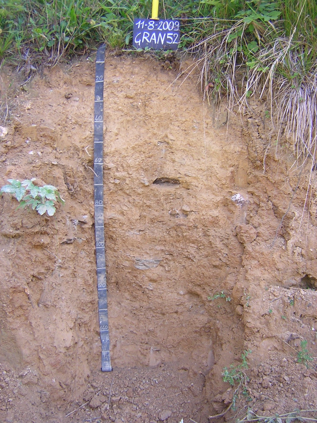 Orizzonte E : 10 - 40 cm; umido; colore giallo brunastro (10YR 6/6); colore subordinato bruno giallastro chiaro (2,5Y 6/4); tipo colore ossidato; tessitura franco limosa; scheletro 37 % , di forma irregolare con diametro medio di 20 mm e diametro massimo di 40 mm, leggermente alterato; struttura poliedrica angolare fine di grado moderato; radici 10/dmq, con dimensioni medie di 1 mm e dimensioni massime di 1 mm, orientamento obliquo; radicabilità 60 % ; resistenza: moderatamente resistente; cementazione molto debole; moderatamente adesivo; moderatamente plastico; non calcareo; limite inferiore chiaro.