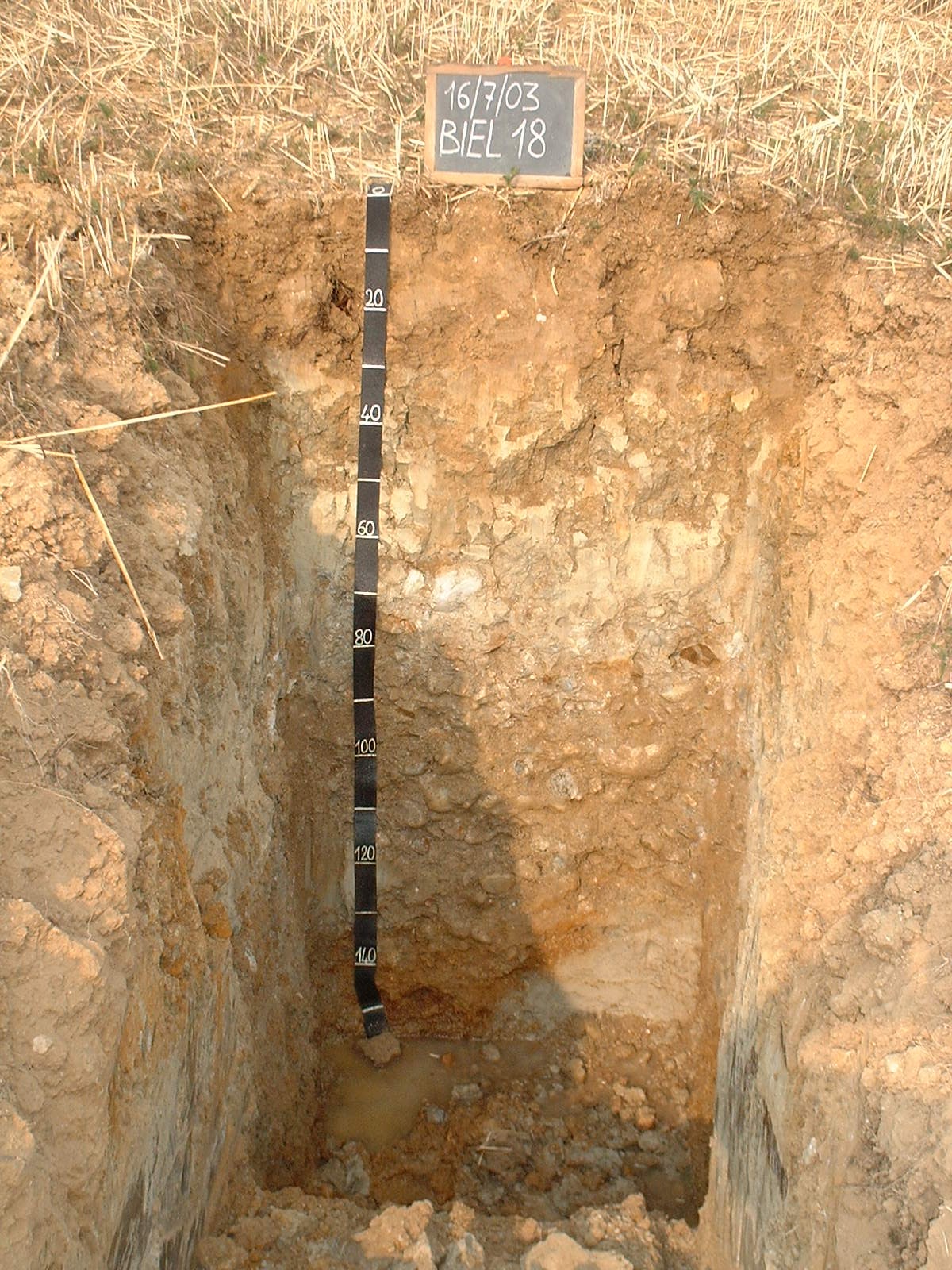 Orizzonte 2C2 : 130 - 140 cm; bagnato; colore bruno intenso (7,5YR 5/6); colore subordinato bruno giallastro scuro (10YR 4/6); tipo colore ossidato; tessitura franco sabbioso argillosa; scheletro 65 % , di forma subarrotondata con diametro medio di 50 mm e diametro massimo di 60 mm, alterato; macropori < 0,1 % con dimensioni medie <1 mm; radicabilità 5 % ; resistenza: incoerente; cementazione molto debole; debolmente adesivo; non plastico; non calcareo; pellicole primarie di argilla 5 %, presenti intorno allo scheletro; limite inferiore abrupto.
