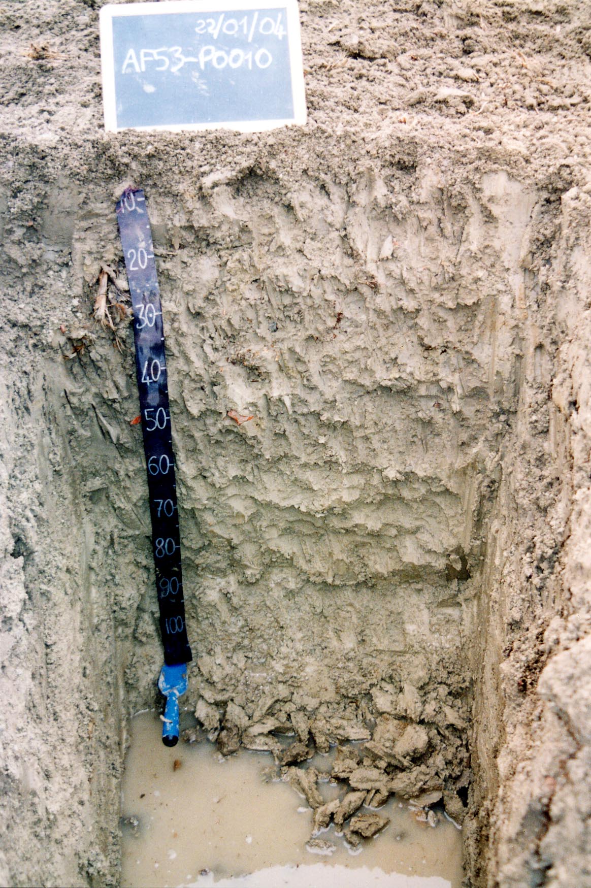 Orizzonte Bg2 : 90 - 110 cm; bagnato; colore giallo pallido (2,5Y 8/2); colore subordinato giallo (2,5Y 8/6); tipo colore ridotto; tessitura franco limoso argillosa; scheletro 0 % , di forma n.i.; struttura poliedrica angolare media di grado moderato; macropori > 0,4 % con dimensioni medie 1-5 mm; radici 1/dmq, con dimensioni medie di 1 mm e dimensioni massime di 1 mm, orientamento obliquo; radicabilità 50 % ; resistenza: moderatamente resistente; cementazione molto debole; moderatamente adesivo; molto plastico; fortemente calcareo; limite inferiore non raggiuto.