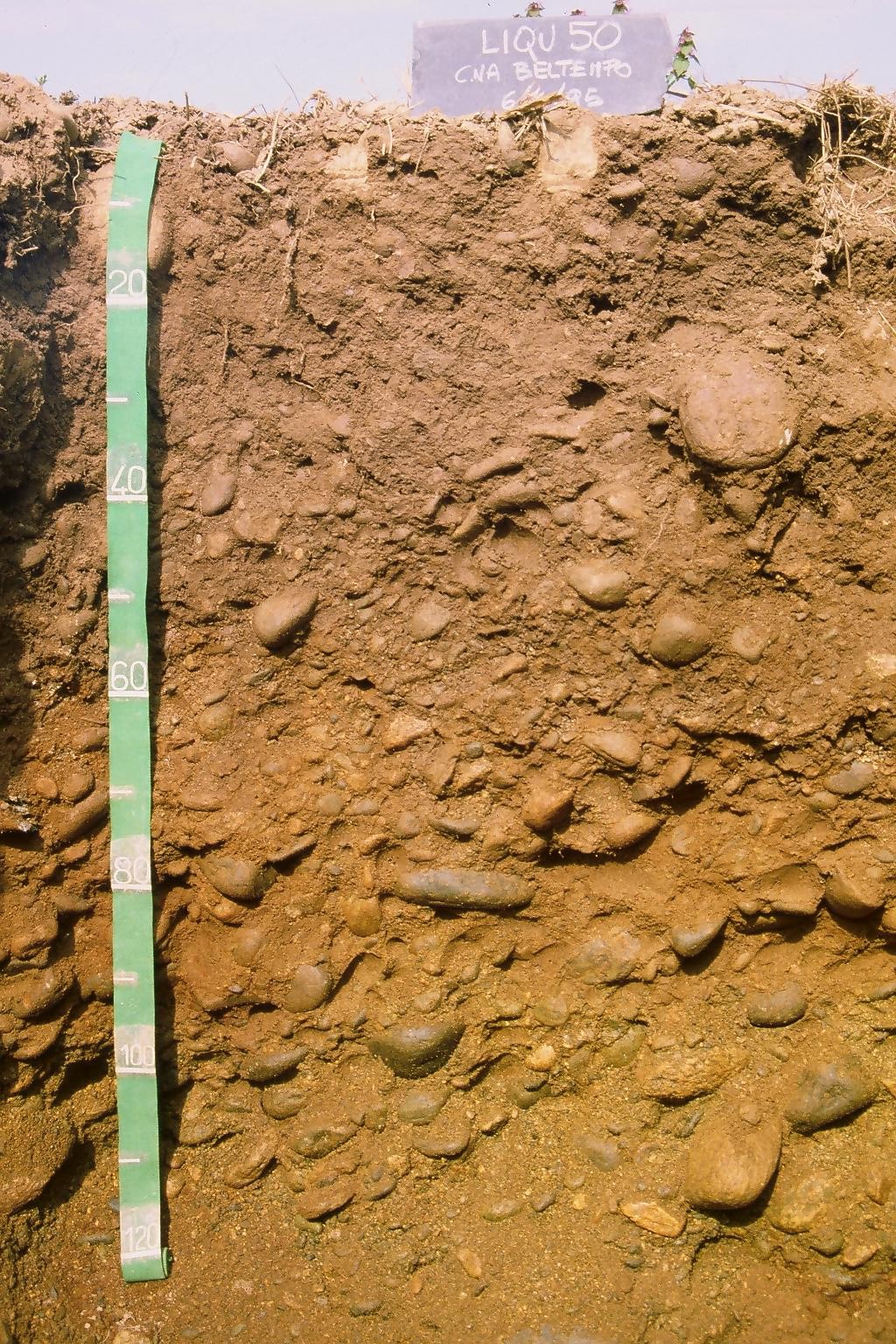Orizzonte C2 : 90 - 120 cm; colore bruno (10YR 5/3); colore subordinato bruno giallastro (10YR 5/6); screziature 2 %, dominanti di colore grigio molto scuro (10YR 3/1); tessitura sabbioso franca; scheletro 90 % , di forma arrotondata con diametro medio di 150 mm e diametro massimo di 350 mm; non calcareo.