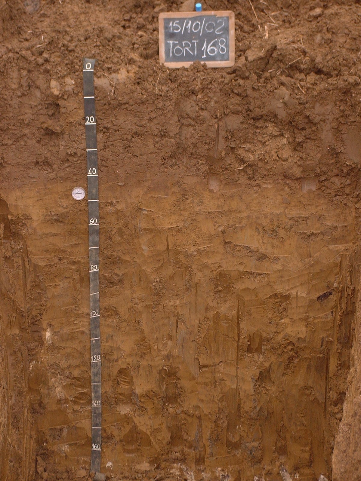 Orizzonte Bt3 : 160 - 170 cm; umido; colore bruno giallastro (10YR 5/6); colore delle facce bruno (7,5YR 5/4); tipo colore variegato; screziature 5 %, con dimensioni medie di 5 mm, con limite netto, dominanti di colore grigio brunastro scuro (10YR 6/2); tessitura argillosa; scheletro 0 % , di forma n.i.; struttura poliedrica angolare media di grado forte; macropori < 0,1 % con dimensioni medie <1 mm; radici 0/dmq, con dimensioni medie di mm , orientamento n.i.; radicabilità 10 % ; resistenza: estremamente resistente; cementazione forte; molto adesivo; molto plastico; non calcareo; masse di ferro-manganese 4 %, 3 mm, presenti nella matrice; concrezioni di carbonati 3 %, 15 mm, presenti nella matrice; pellicole primarie di argilla 15 %, presenti intorno allo scheletro, pellicole secondarie ferromanganesifere 5 %, presenti sulle facce degli aggregati; limite inferiore non raggiuto.