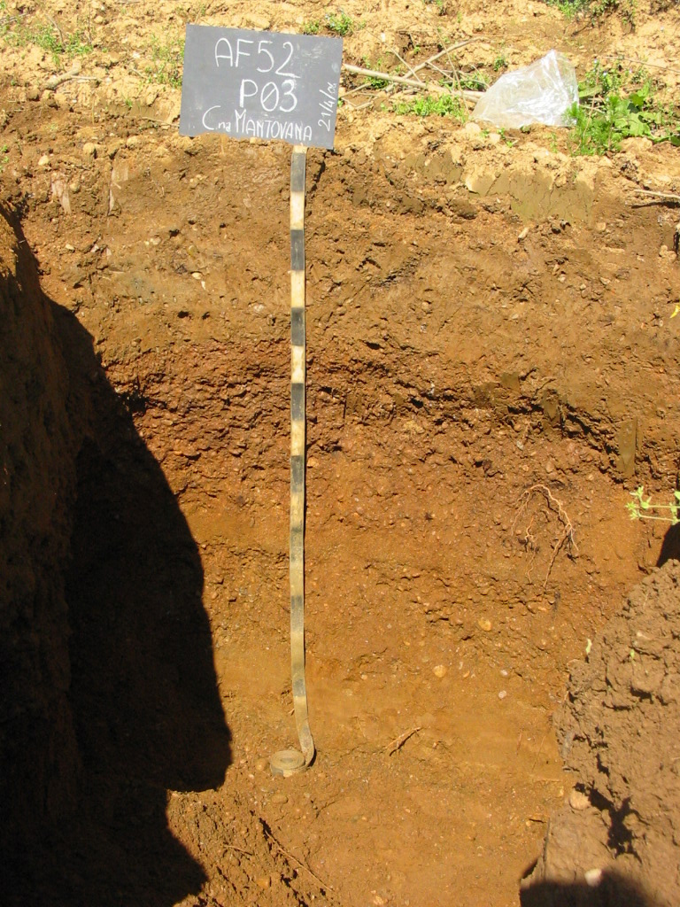 Orizzonte Bt : 50 - 75 cm; bagnato; colore bruno rossastro (5YR 4/4); tipo colore ossidato; tessitura franco sabbiosa; scheletro 36 % , di forma arrotondata con diametro medio di 10 mm e diametro massimo di 30 mm, non alterato; struttura poliedrica subangolare media di grado moderato; macropori < 0,1 % con dimensioni medie <1 mm; radici 8/dmq, con dimensioni medie di 2 mm e dimensioni massime di 3 mm, orientamento orizzontale; radicabilità 70 % ; resistenza: debole; cementazione molto debole; non calcareo; masse di ferro-manganese 3 %, 10 mm, presenti intorno allo scheletro; pellicole primarie di argilla 3 %, presenti intorno allo scheletro; limite inferiore graduale.