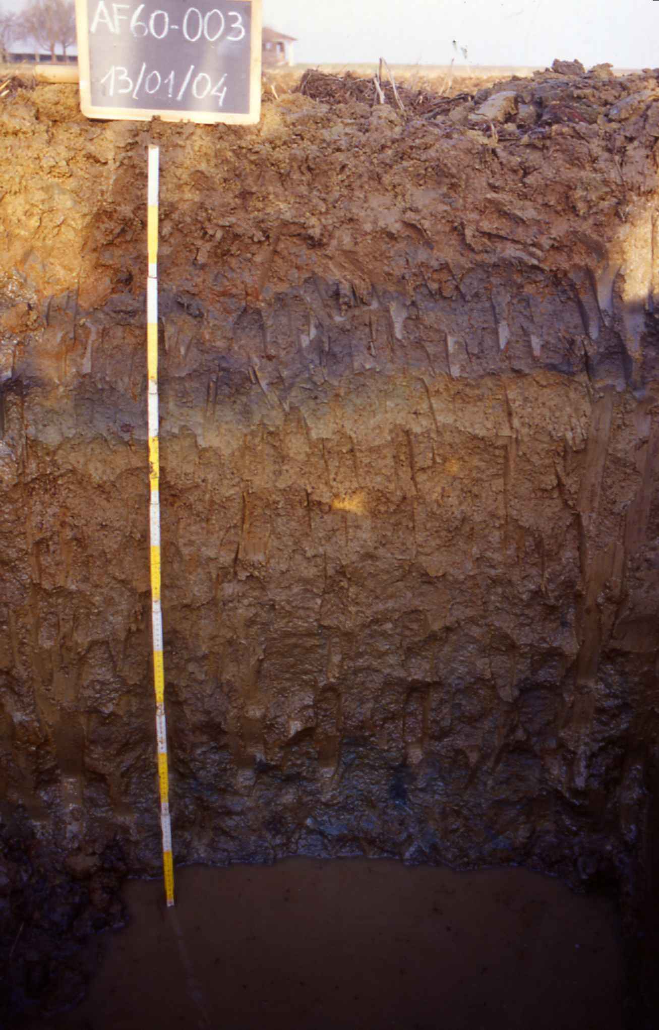 Orizzonte Btw : 45 - 75 cm; bagnato; colore bruno giallastro (10YR 5/6); screziature 40 %, con dimensioni medie di 5 mm, con limite chiaro, dominanti di colore bruno grigiastro (2,5Y 5/2); tessitura franca; scheletro 0 % , di forma n.i.; macropori > 0,4 % con dimensioni medie <1 mm; radici 0/dmq, con dimensioni medie di mm , orientamento n.i.; radicabilità 90 % ; resistenza: moderatamente resistente; debolmente adesivo; moderatamente plastico; non calcareo; masse di ferro-manganese 10 %, 3 mm, presenti n.i.; limite inferiore graduale.