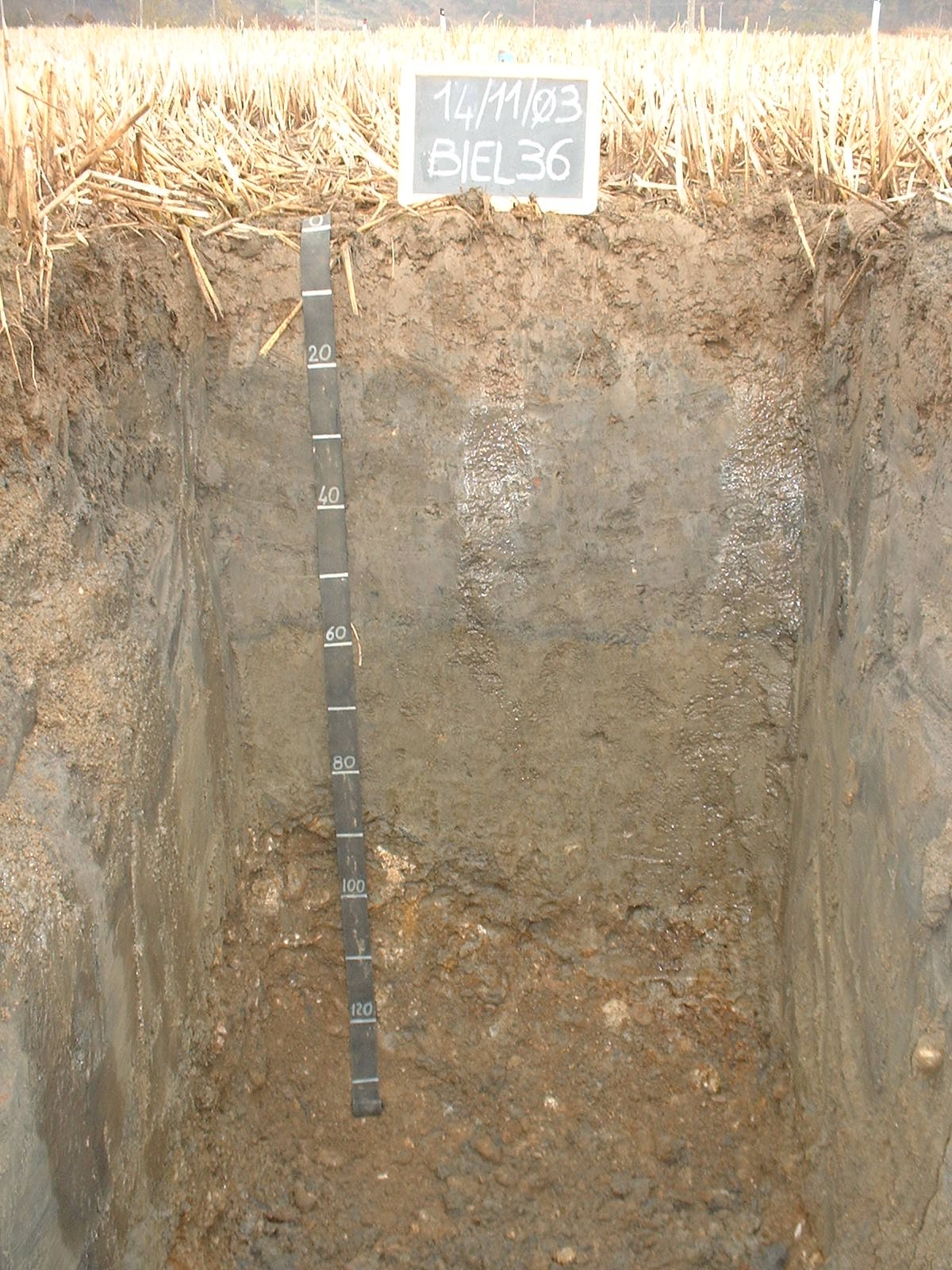 Orizzonte Cg : 90 - 120 cm; umido; colore bruno (10YR 4/3); tipo colore variegato; screziature 15 %, con dimensioni medie di 15 mm, con limite netto, dominanti di colore grigio (10YR 5/1); tessitura sabbioso franca; scheletro 60 % , di forma arrotondata con diametro medio di 35 mm e diametro massimo di 90 mm; macropori < 0,1 % con dimensioni medie <1 mm; radici 0/dmq, con dimensioni medie di mm , orientamento n.i.; radicabilità 10 % ; resistenza: incoerente; cementazione molto debole; non adesivo; non plastico; non calcareo; limite inferiore non raggiuto.