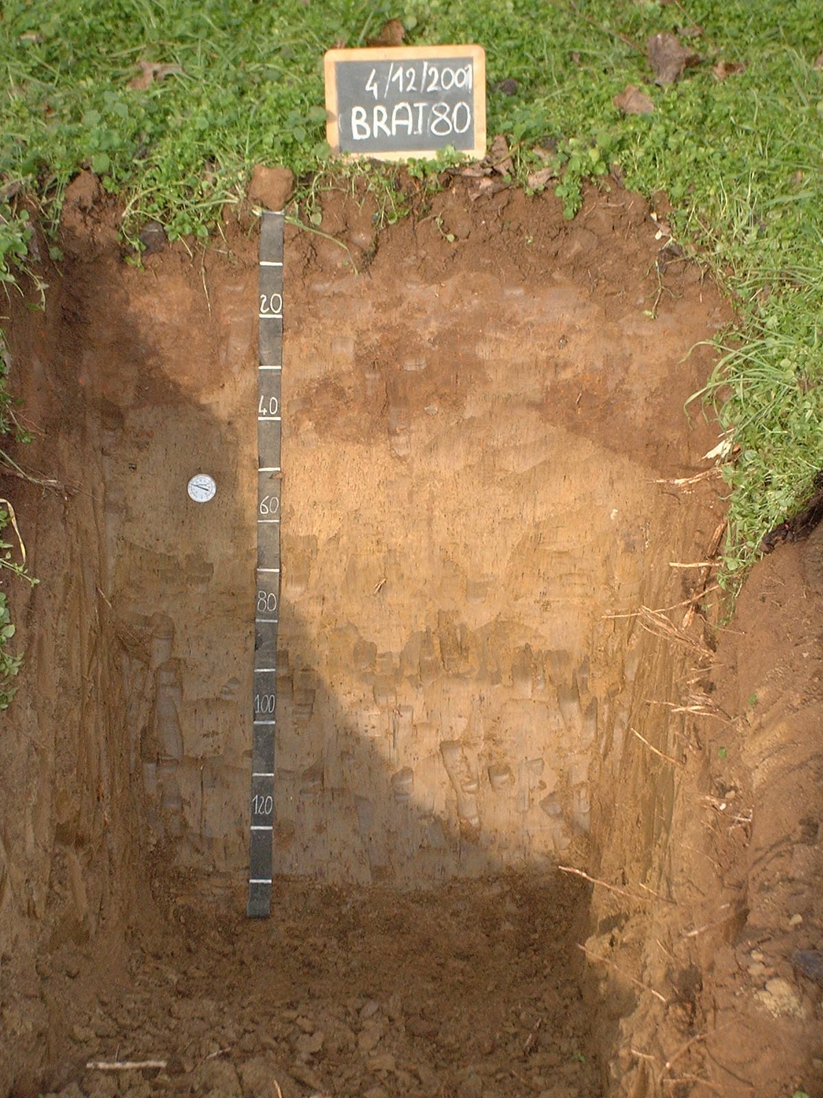 Orizzonte Btg : 95 - 140 cm; umido; colore bruno (10YR 5/3); tipo colore variegato; screziature 35 %, con dimensioni medie di 15 mm, con limite netto, dominanti di colore grigio scuro (10YR 4/1), secondarie di colore bruno giallastro (10YR 5/6); tessitura franco limoso argillosa; scheletro 0 % , di forma n.i.; struttura poliedrica angolare media di grado moderato; macropori 0,1-0,4 % con dimensioni medie <1 mm; radici 1/dmq, con dimensioni medie di 5 mm e dimensioni massime di 10 mm, orientamento orizzontale; radicabilità 15 % ; resistenza: rigido; cementazione forte; moderatamente adesivo; moderatamente plastico; non calcareo; masse di ferro-manganese 4 %, 4 mm, presenti nella matrice; pellicole primarie di argilla 5 %, presenti sulle facce degli aggregati; limite inferiore non raggiuto.