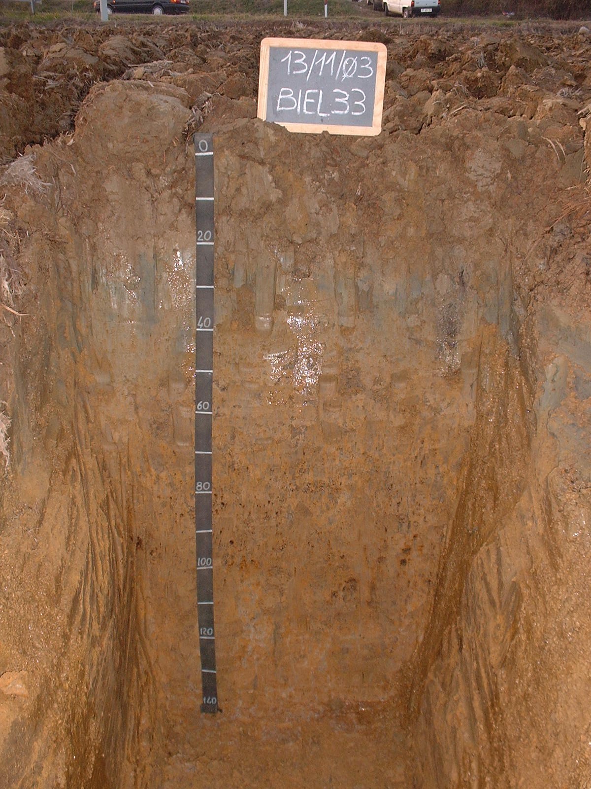Orizzonte Btc : 70 - 100 cm; umido; colore bruno giallastro (10YR 5/6); colore delle facce bruno (10YR 5/3); tipo colore variegato; screziature 5 %, con dimensioni medie di 2 mm, con limite chiaro, dominanti di colore bruno intenso (7,5YR 5/6); tessitura franco argillosa; scheletro 0 % , di forma n.i.; struttura poliedrica angolare fine di grado forte; macropori < 0,1 % con dimensioni medie <1 mm; radicabilità 20 % ; resistenza: resistente; cementazione debole; moderatamente adesivo; moderatamente plastico; non calcareo; noduli di ferro-manganese 6 %, 8 mm, presenti nella matrice; masse di ferro-manganese 3 %, 2 mm, presenti nella matrice; pellicole primarie di argilla 50 %, presenti sulle facce degli aggregati, pellicole secondarie ferromanganesifere 20 %, presenti sulle facce degli aggregati; limite inferiore chiaro.