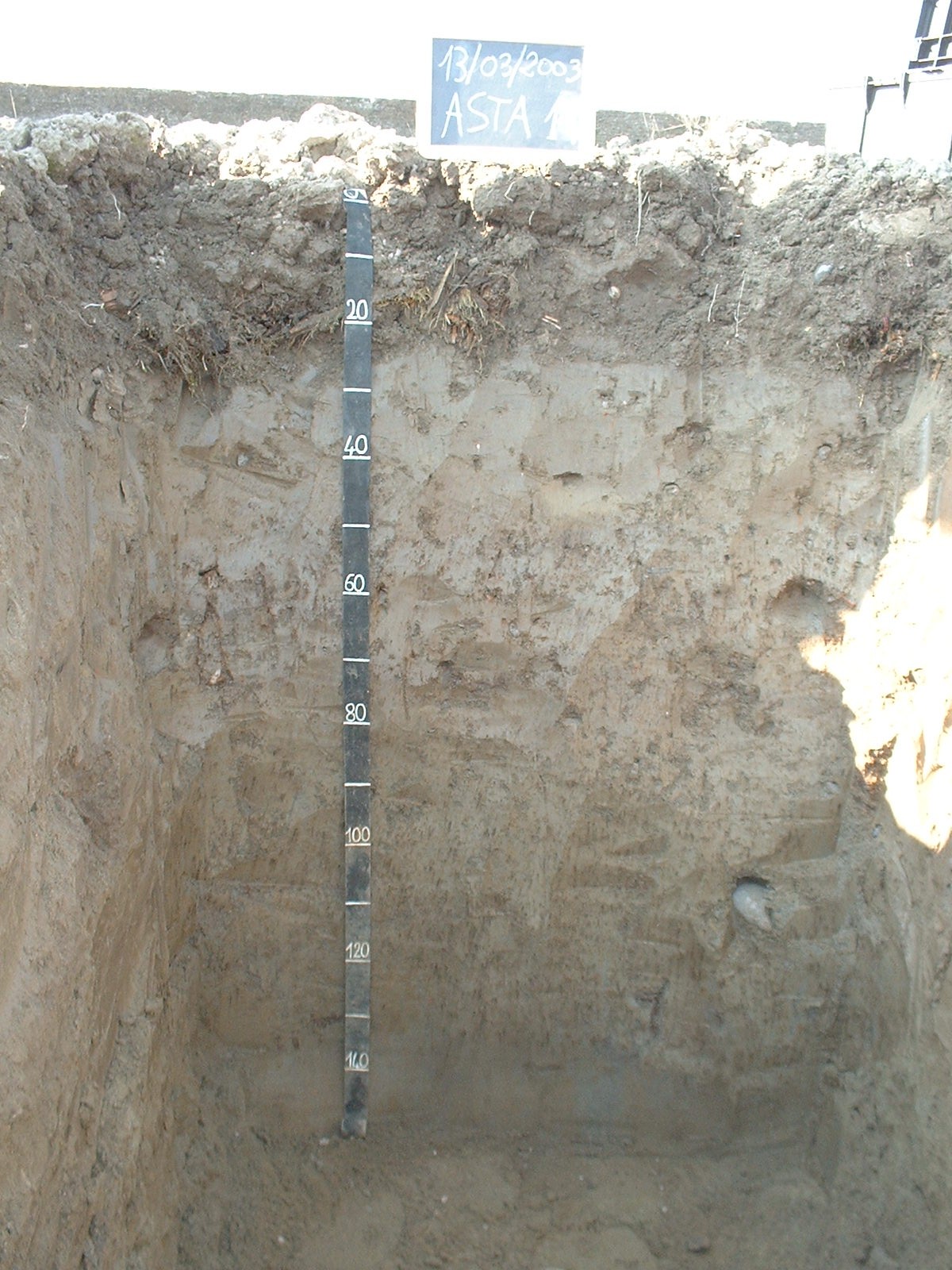 Orizzonte ABg : 50 - 95 cm; umido; colore grigio scuro (5Y 4/1); tipo colore variegato; screziature 15 %, con dimensioni medie di 5 mm, con limite chiaro, dominanti di colore bruno olivastro (2,5Y 4/3), secondarie di colore bruno scuro (10YR 3/3); tessitura franca; scheletro 2 % , di forma subarrotondata e diametro massimo di 50 mm, leggermente alterato; macropori < 0,1 % con dimensioni medie <1 mm; radicabilità 60 % ; resistenza: resistente; cementazione molto debole; debolmente adesivo; debolmente plastico; debolmente calcareo; masse di ferro-manganese 10 %, 3 mm, presenti nella matrice; limite inferiore graduale.