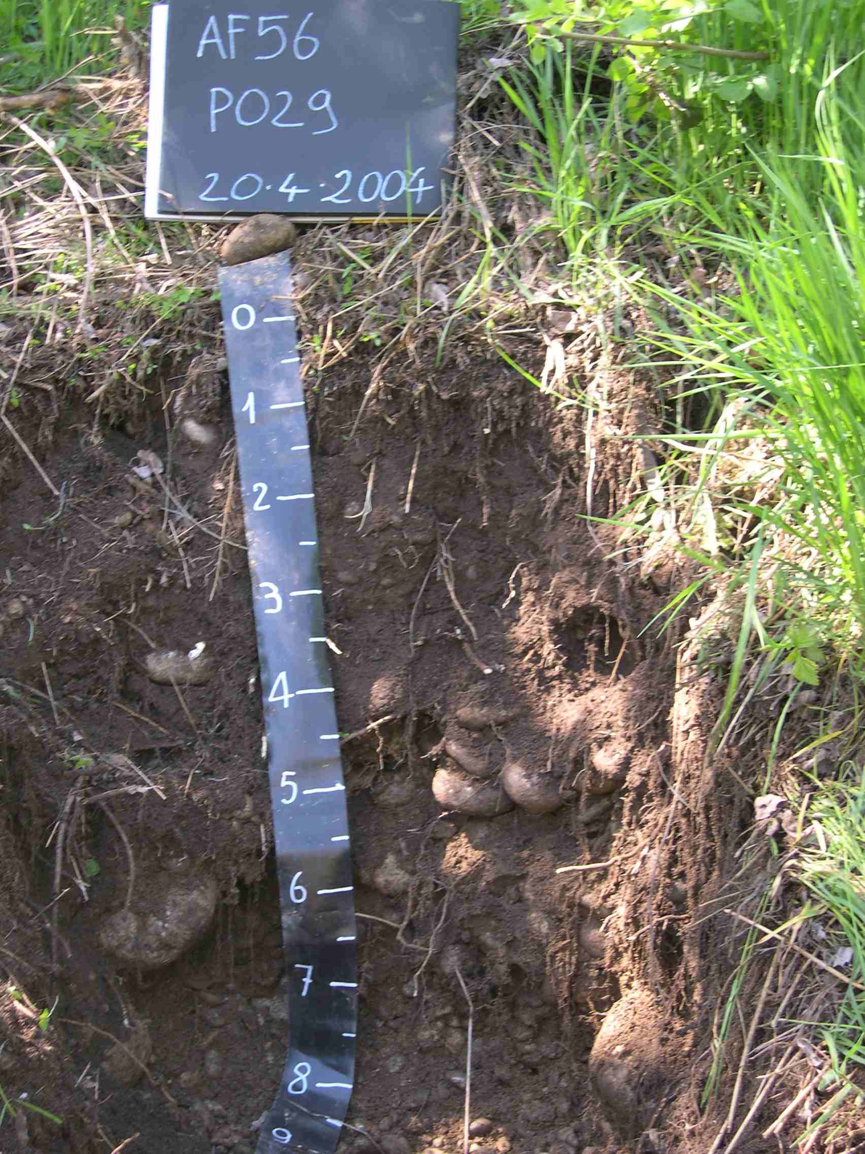 Orizzonte C : 50 - 80 cm; umido; colore bruno (10YR 5/3); tessitura sabbiosa; scheletro 65 % , di forma arrotondata con diametro medio di 60 mm e diametro massimo di 200 mm, leggermente alterato; radici 6/dmq, con dimensioni medie di 1 mm e dimensioni massime di 3 mm, orientamento nessuno; radicabilità 30 % ; resistenza: incoerente; cementazione molto debole; non adesivo; non plastico; debolmente calcareo; limite inferiore abrupto.