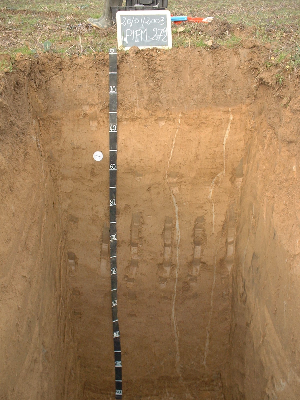 Orizzonte Bt2 : 190 - 200 cm; umido; colore bruno giallastro scuro (10YR 4/4); colore delle facce bruno intenso (7,5YR 4/6); tipo colore variegato; screziature 30 %, con dimensioni medie di 10 mm, con limite netto, dominanti di colore grigio chiaro (2,5Y 7/2); tessitura franco limosa; scheletro 0 % , di forma n.i.; struttura poliedrica angolare media di grado forte; macropori 0,1-0,4 % con dimensioni medie 1-5 mm; radicabilità 50 % ; resistenza: resistente; cementazione molto debole; debolmente adesivo; debolmente plastico; non calcareo; masse di ferro-manganese 2 %, 2 mm, presenti nella matrice; noduli di ferro-manganese 1 %, 1 mm, presenti nella matrice; pellicole primarie di argilla 30 %, presenti sulle facce degli aggregati; limite inferiore non raggiuto.