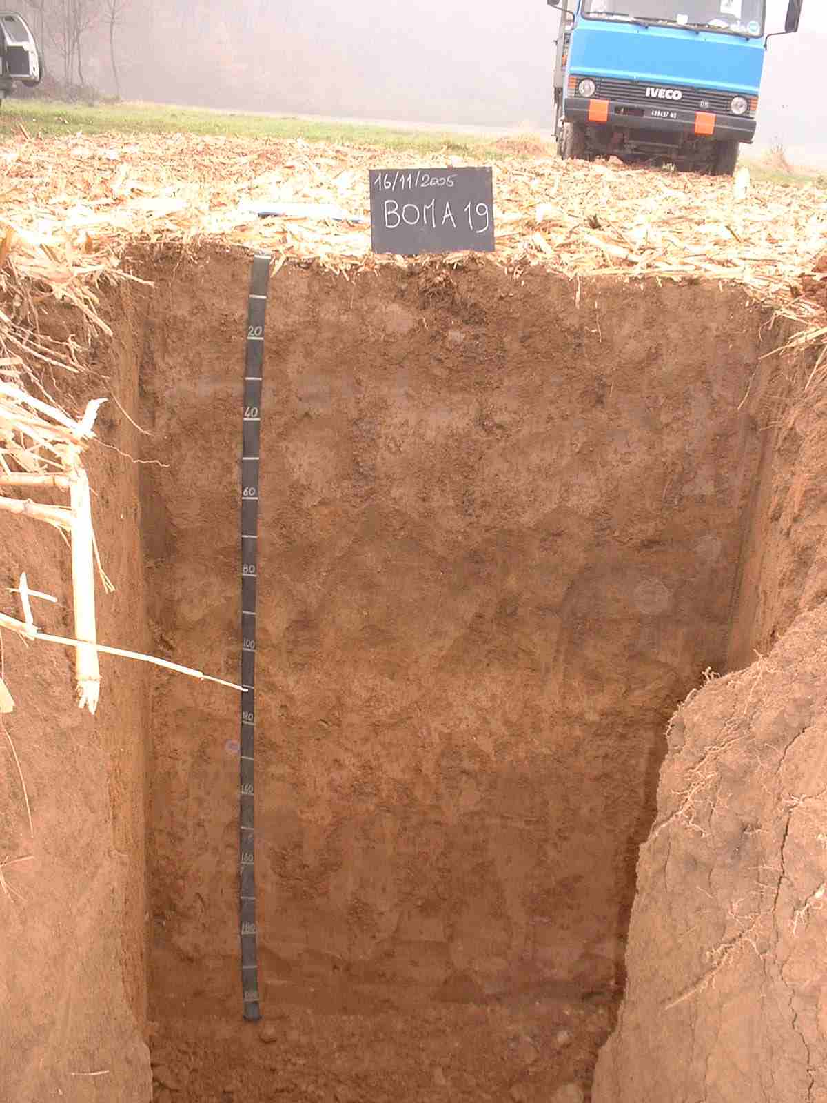 Orizzonte BA : 60 - 80 cm; umido; colore bruno giallastro scuro (10YR 4/4); tipo colore ossidato; tessitura franco limoso argillosa; scheletro 0 % , di forma n.i.; struttura prismatica colonnare media di grado moderato; macropori < 0,1 % con dimensioni medie 1-5 mm; radici 6/dmq, con dimensioni medie di 1 mm e dimensioni massime di 1 mm, orientamento nessuno; radicabilità 60 % ; resistenza: moderatamente resistente; cementazione molto debole; moderatamente adesivo; moderatamente plastico; non calcareo; limite inferiore netto.