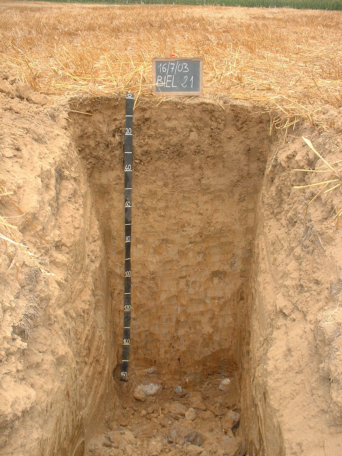 Orizzonte EB : 50 - 75 cm; secco; colore bruno giallastro (10YR 5/4); colore subordinato bruno (10YR 5/3); tipo colore variegato; screziature 20 %, con dimensioni medie di 15 mm, con limite chiaro, dominanti di colore giallo rossastro (7,5YR 6/8); tessitura franco limoso argillosa; scheletro 0 % , di forma n.i.; struttura poliedrica angolare fine di grado moderato; macropori 0,1-0,4 % con dimensioni medie 1-5 mm; radicabilità 50 % ; resistenza: resistente; cementazione molto debole; moderatamente adesivo; moderatamente plastico; non calcareo; masse di ferro-manganese 1 %, 2 mm, presenti nella matrice; pellicole primarie di argilla 1 %, presenti sulle facce degli aggregati; limite inferiore chiaro.