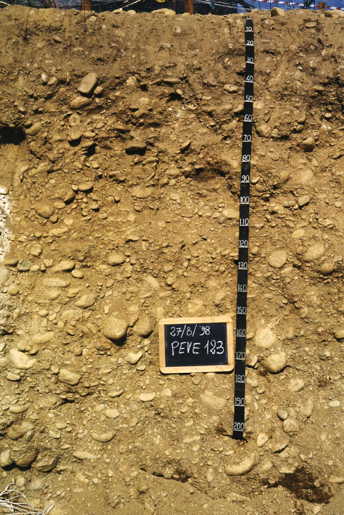 Orizzonte C2 : 160 - 230 cm; umido; colore bruno giallastro (10YR 5/6); tessitura sabbiosa; scheletro 75 % , di forma subarrotondata con diametro medio di 70 mm e diametro massimo di 200 mm, leggermente alterato; radici 0/dmq, con dimensioni medie di mm , orientamento n.i.; cementazione molto debole; non adesivo; non plastico; non calcareo; limite inferiore non raggiuto.