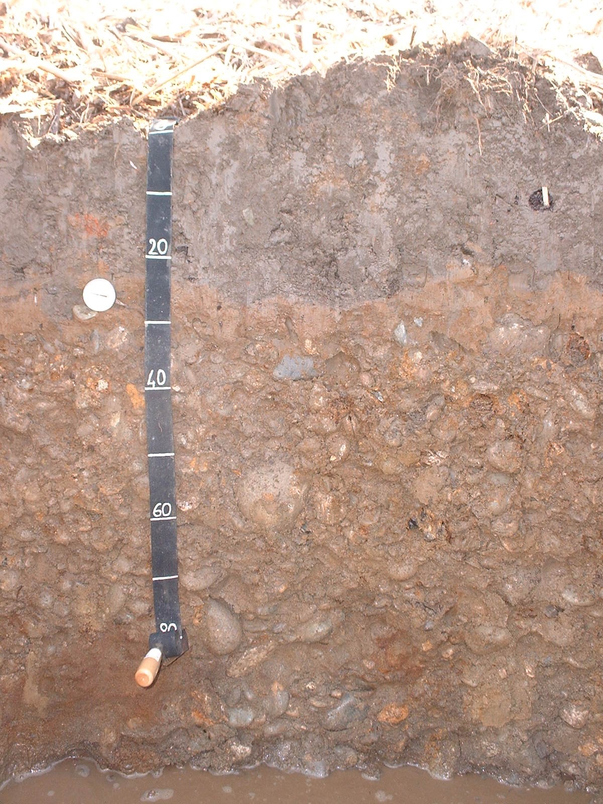 Topsoil caratterizzato da colore variabile a seconda del periodo dell'anno: durante la fase di sommersione e prima delle lavorazioni è grigio scuro, successivamente alle lavorazioni si ossida leggermente sino a divenire olivastro; la tessitura è prevalentemente franca, lo scheletro presente fino a circa il 10% e la reazione subacida tendente all'acido. Il subsoil ha colori nettamente variegati con alternanza di grigio e bruno, tessitura franco-sabbiosa e scheletro molto abbondante (spesso oltre il 60%), la reazione è neutra. Il substrato è costituito da ghiaie e sabbie originate da alluvioni relativamente antiche.