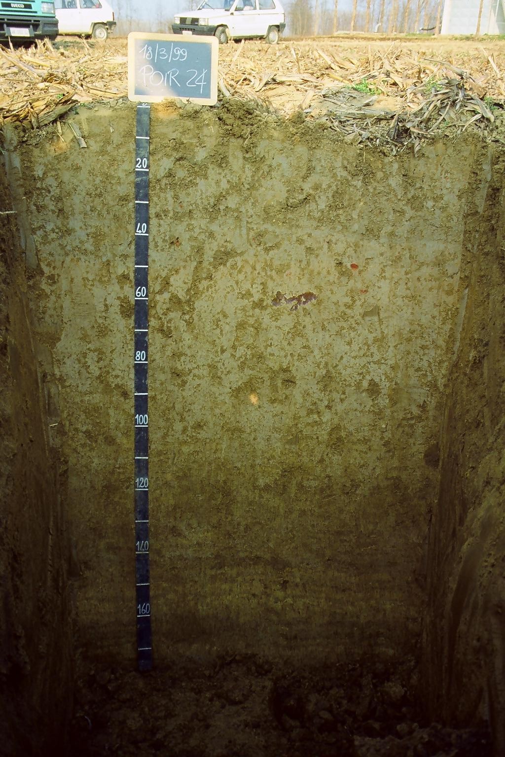 Orizzonte C : 140 - 180 cm; umido; colore bruno giallastro chiaro (2,5Y 6/3); tipo colore variegato; screziature 20 %, con dimensioni medie di 3 mm, con limite diffuso, dominanti di colore bruno giallastro (10YR 5/8), secondarie di colore bruno molto pallido (10YR 7/4); tessitura sabbioso franca; scheletro 0 % , di forma n.i.; struttura poliedrica angolare media di grado debole; macropori > 0,4 % con dimensioni medie 1-5 mm; radici 0/dmq, con dimensioni medie di mm , orientamento n.i.; resistenza: incoerente; cementazione molto debole; non adesivo; debolmente plastico; non calcareo; limite inferiore non raggiuto.