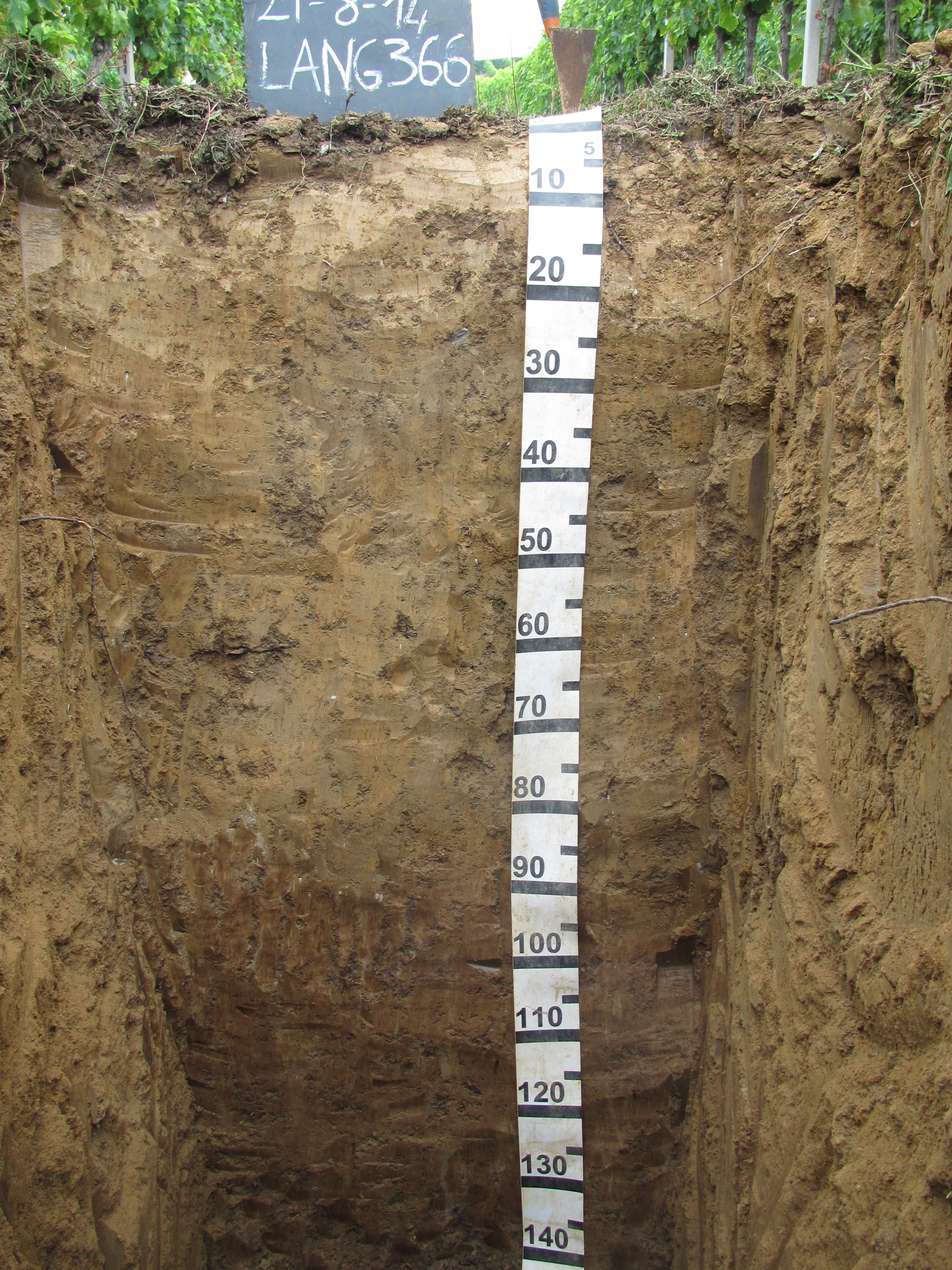 Orizzonte Bt2 : 120 - 150 cm; umido; colore bruno (7,5YR 4/4); screziature 30 %, con dimensioni medie di 20 mm, con limite chiaro, dominanti di colore grigio brunastro chiaro (2,5Y 6/2); tessitura franco limosa; scheletro 0 % , di forma n.i.; struttura prismatica colonnare grossolana di grado forte; radici 1/dmq, con dimensioni medie di 1 mm e dimensioni massime di 1 mm, orientamento n.i.; radicabilità 40 % ; resistenza: resistente; cementazione molto debole; debolmente adesivo; debolmente plastico; calcareo; masse di ferro-manganese 5 %, 4 mm, presenti nella matrice; pellicole primarie : ponti di argilla (tra i granuli di sabbia) 2 %, presenti n.i.; limite inferiore non raggiuto.