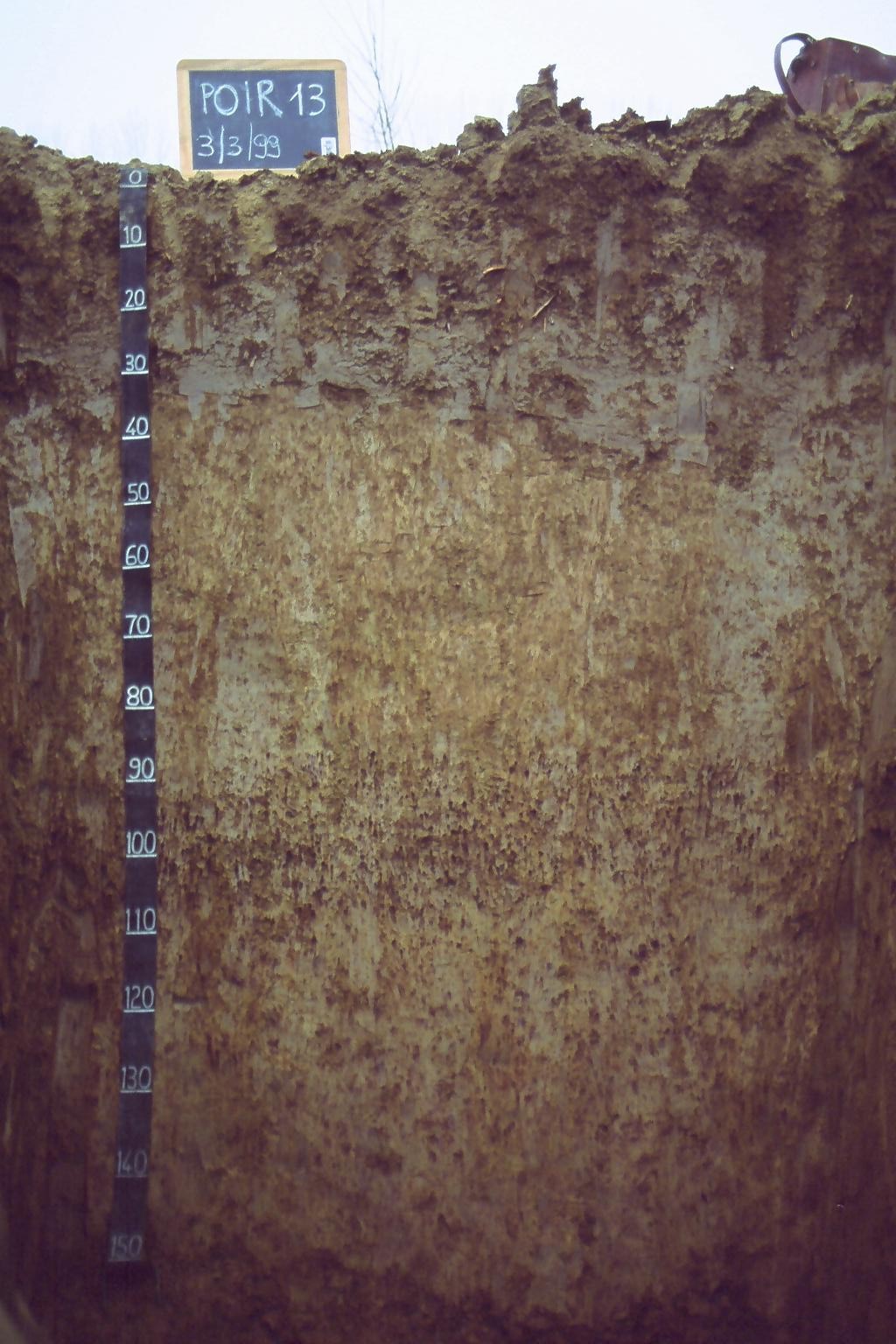 Orizzonte Bcs : 90 - 110 cm; umido; colore bruno giallastro (10YR 5/4); tipo colore variegato; screziature 5 %, con dimensioni medie di 2 mm, con limite n.i., dominanti di colore bruno giallastro (10YR 5/8); tessitura franco limosa; scheletro 0 % , di forma n.i.; struttura poliedrica angolare media di grado moderato; radici 0/dmq, con dimensioni medie di mm , orientamento n.i.; resistenza: resistente; cementazione debole; moderatamente adesivo; moderatamente plastico; non calcareo; noduli di ferro-manganese 30 %, 3 mm, presenti nella matrice; pellicole primarie ferromanganesifere 10 %, presenti sulle facce degli aggregati, pellicole secondarie di argilla 2 %, presenti sulle facce degli aggregati; limite inferiore chiaro.