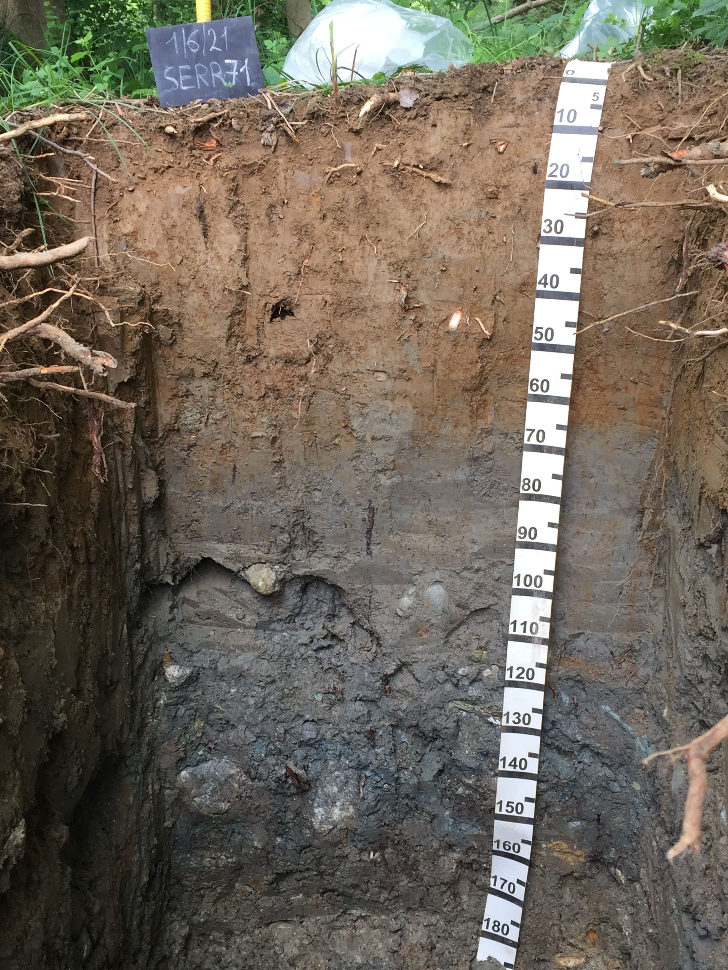 Orizzonte Cg : 65 - 110 cm; umido; colore grigio olivastro chiaro (5Y 6/2); colore subordinato grigio (5Y 6/1); tipo colore ridotto; screziature 6 %, con dimensioni medie di 4 mm, con limite chiaro, dominanti di colore bruno giallastro (10YR 5/6); tessitura franco sabbiosa; scheletro 55 % , di forma irregolare con diametro medio di 100 mm e diametro massimo di 400 mm, alterato; struttura poliedrica subangolare grossolana di grado moderato; macropori 0,1-0,4 % con dimensioni medie >5 mm; radici 5/dmq, con dimensioni medie di 3 mm e dimensioni massime di 10 mm, orientamento orizzontale; radicabilità 50 % ; resistenza: debole; cementazione molto debole; non adesivo; non plastico; non calcareo; masse di ferro-manganese 1 %, 2 mm, presenti nella matrice; limite inferiore diffuso.