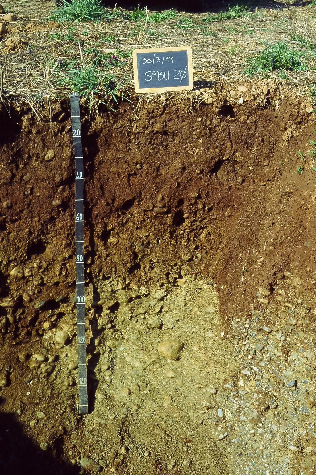 Orizzonte Bt : 30 - 55 cm; umido; colore bruno scuro (7,5YR 3/4); colore subordinato bruno rossastro scuro (5YR 3/4); tipo colore ossidato; tessitura franco argillosa; scheletro 15 % , di forma subarrotondata, leggermente alterato; struttura poliedrica subangolare media di grado debole; radici 3/dmq, con dimensioni medie di 1 mm e dimensioni massime di 1 mm, orientamento n.i.; resistenza: debole; cementazione molto debole; moderatamente adesivo; debolmente plastico; non calcareo; pellicole primarie di argilla 5 %, presenti n.i.; limite inferiore chiaro.