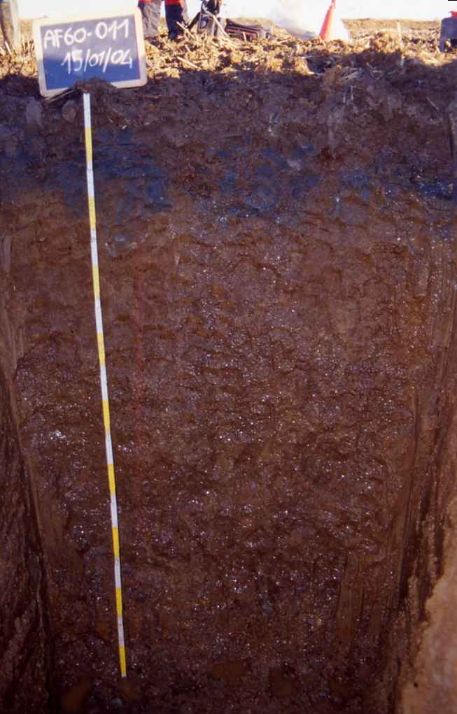Orizzonte Bx : 50 - 100 cm; umido; colore bruno scuro (7,5YR 3/4); screziature 10 %, con dimensioni medie di 25 mm, con limite chiaro, dominanti di colore bruno olivastro chiaro (2,5Y 5/3), secondarie di colore bruno intenso (7,5YR 4/6); tessitura franco argillosa; scheletro 0 % , di forma n.i.; struttura poliedrica angolare grossolana di grado forte; macropori 0,1-0,4 % con dimensioni medie <1 mm; cementazione forte; non calcareo; masse di ferro-manganese; pellicole primarie di argilla 5 %, presenti n.i., pellicole secondarie ferromanganesifere 5 %, presenti n.i.; limite inferiore chiaro.