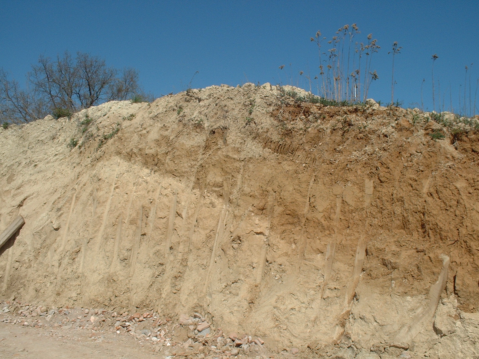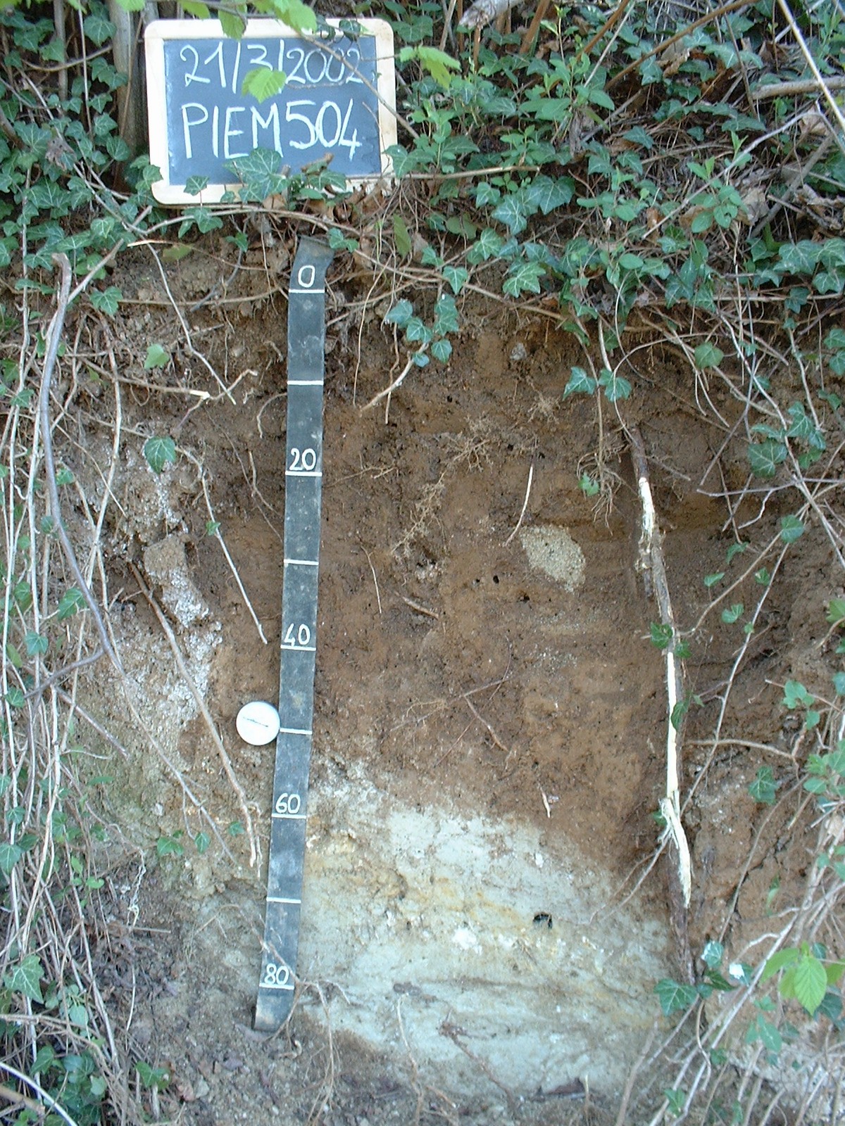 Orizzonte Bt : 15 - 60 cm; umido; colore bruno giallastro scuro (10YR 4/4); colore subordinato bruno giallastro (10YR 5/6); colore delle facce bruno (7,5YR 5/4); tipo colore ossidato; tessitura franca; scheletro 2 % , di forma irregolare con diametro medio di 30 mm e diametro massimo di 70 mm, leggermente alterato; struttura poliedrica subangolare media di grado debole; macropori > 0,4 % con dimensioni medie >5 mm; radici 20/dmq, con dimensioni medie di 2 mm e dimensioni massime di 10 mm, orientamento verticale; radicabilità 90 % ; resistenza: debole; cementazione molto debole; non adesivo; non plastico; molto fortemente calcareo; masse di carbonati 2 %, 7 mm, presenti nella matrice; pellicole primarie di argilla 10 %, presenti sulle facce degli aggregati; limite inferiore abrupto.