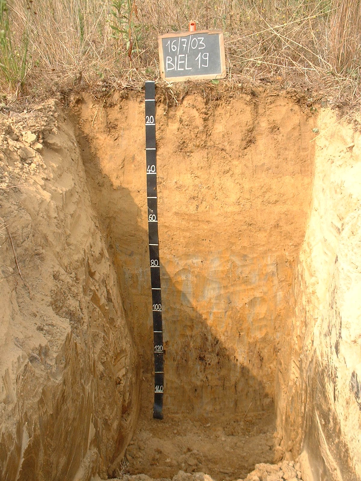 Orizzonte EB : 55 - 72 cm; secco; colore bruno giallastro (10YR 5/6); colore subordinato bruno giallastro (10YR 5/4); tipo colore variegato; screziature 35 %, con dimensioni medie di 10 mm, con limite chiaro, dominanti di colore bruno giallastro chiaro (2,5Y 6/3); tessitura franco argillosa; scheletro 0 % , di forma n.i.; struttura lamellare media di grado moderato; macropori < 0,1 % con dimensioni medie 1-5 mm; radici 2/dmq, con dimensioni medie di 1 mm e dimensioni massime di 1 mm, orientamento verticale; radicabilità 50 % ; resistenza: resistente; cementazione debole; debolmente adesivo; debolmente plastico; non calcareo; masse di ferro-manganese 2 %, 1 mm, presenti nella matrice; noduli di ferro-manganese 1 %, 2 mm, presenti nella matrice; limite inferiore netto.