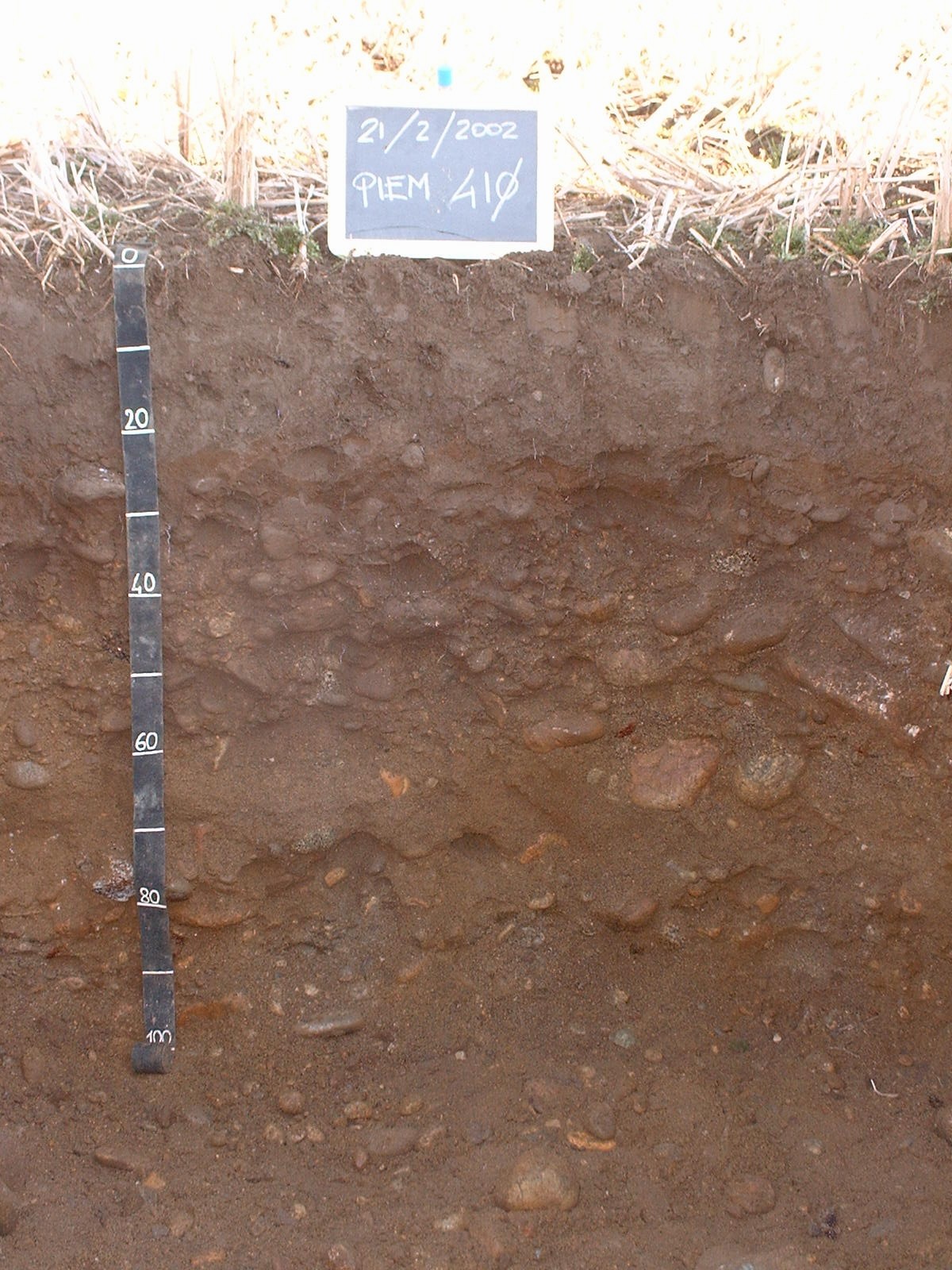 Topsoil fra 0 e 25 cm, di colore bruno grigiastro molto scuro variegato; tessitura franco sabbiosa; scheletro scarso, di forma subarrotondata, leggermente alterato; struttura a zolle; subsoil composto da un orizzonte BC compreso fra 25 e 50 cm, di colore bruno grigiastro scuro e bruno giallastro scuro, tessitura franco sabbiosa, struttura poliedrica subangolare media di grado debole; e da un orizzonte C di colore bruno olivastro chiaro e bruno giallastro chiaro; tessitura sabbiosa; scheletro abbondante, di forma subarrotondata, con diametro medio di 60 mm e diametro massimo di 350 mm, alterato.