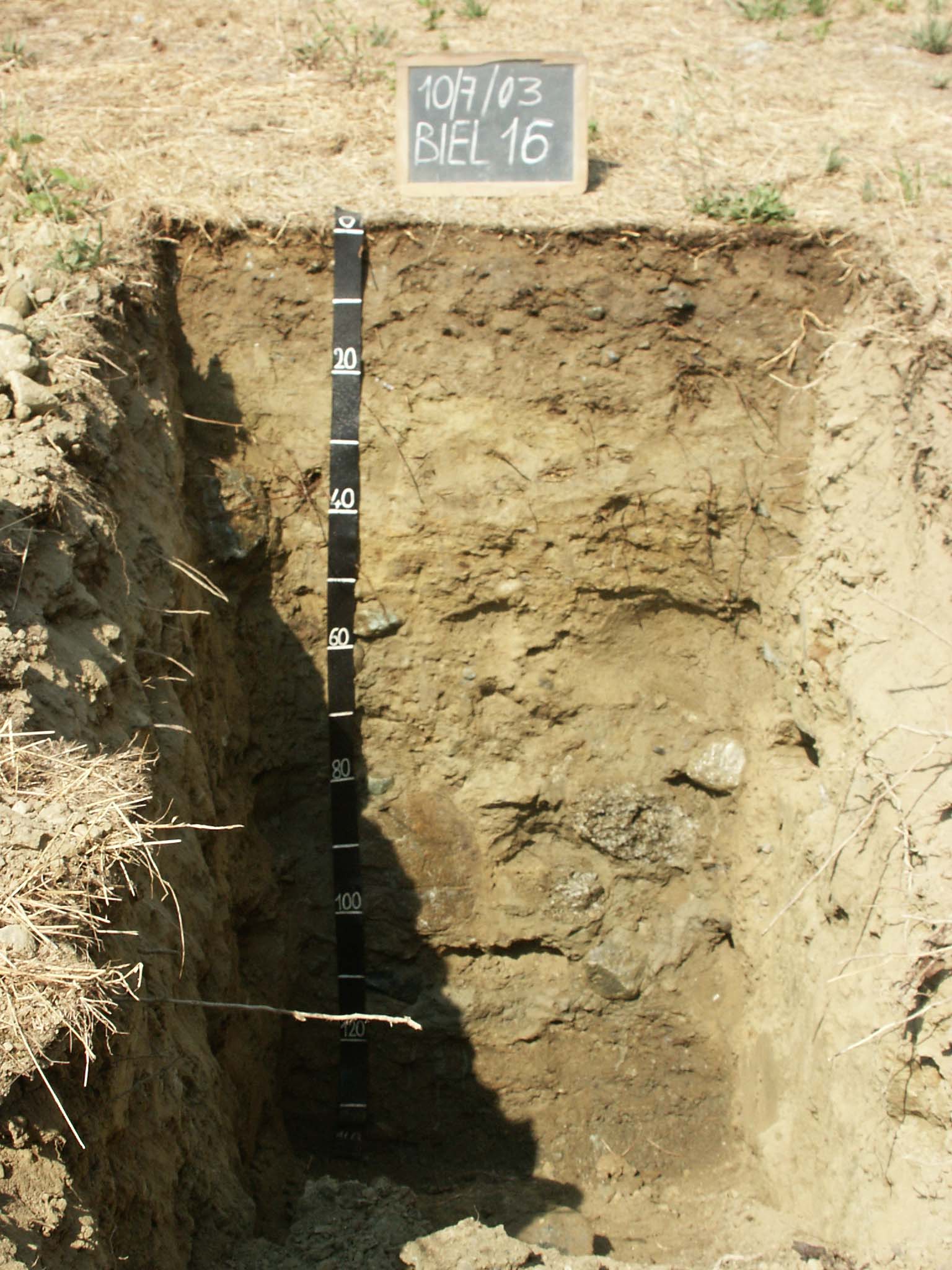 Orizzonte Bw2 : 40 - 60 cm; secco; colore bruno giallastro chiaro (2,5Y 6/4); tipo colore ossidato; screziature 15 %, con dimensioni medie di 5 mm, con limite chiaro, dominanti di colore bruno olivastro (2,5Y 4/4); tessitura franca; scheletro 20 % , di forma irregolare con diametro medio di 30 mm e diametro massimo di 60 mm, alterato; struttura poliedrica angolare media di grado moderato; macropori < 0,1 % con dimensioni medie <1 mm; radici 3/dmq, con dimensioni medie di 2 mm e dimensioni massime di 3 mm, orientamento n.i.; radicabilità 50 % ; resistenza: debole; cementazione molto debole; debolmente adesivo; debolmente plastico; non calcareo; limite inferiore chiaro.