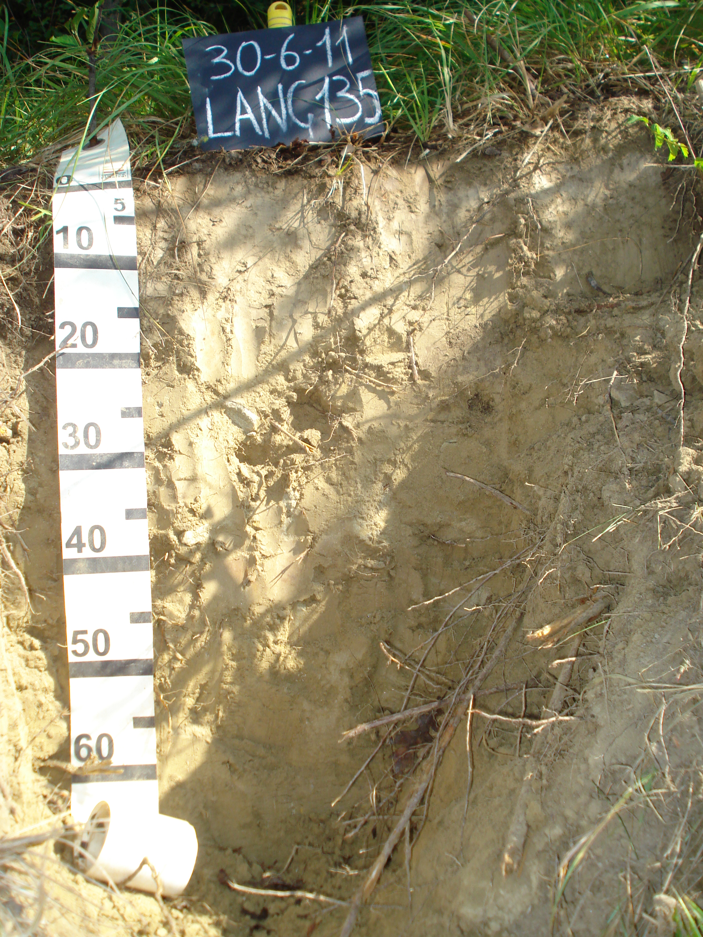 Orizzonte Ah : 0 - 4 cm; umido; colore bruno olivastro chiaro (2,5Y 5/3); tipo colore ossidato; tessitura franco sabbiosa; scheletro 0 % , di forma n.i.; struttura granulare fine di grado debole; radici 25/dmq, con dimensioni medie di 1 mm e dimensioni massime di 2 mm, orientamento orizzontale; radicabilità 90 % ; resistenza: incoerente; cementazione molto debole; non adesivo; non plastico; calcareo; limite inferiore chiaro.