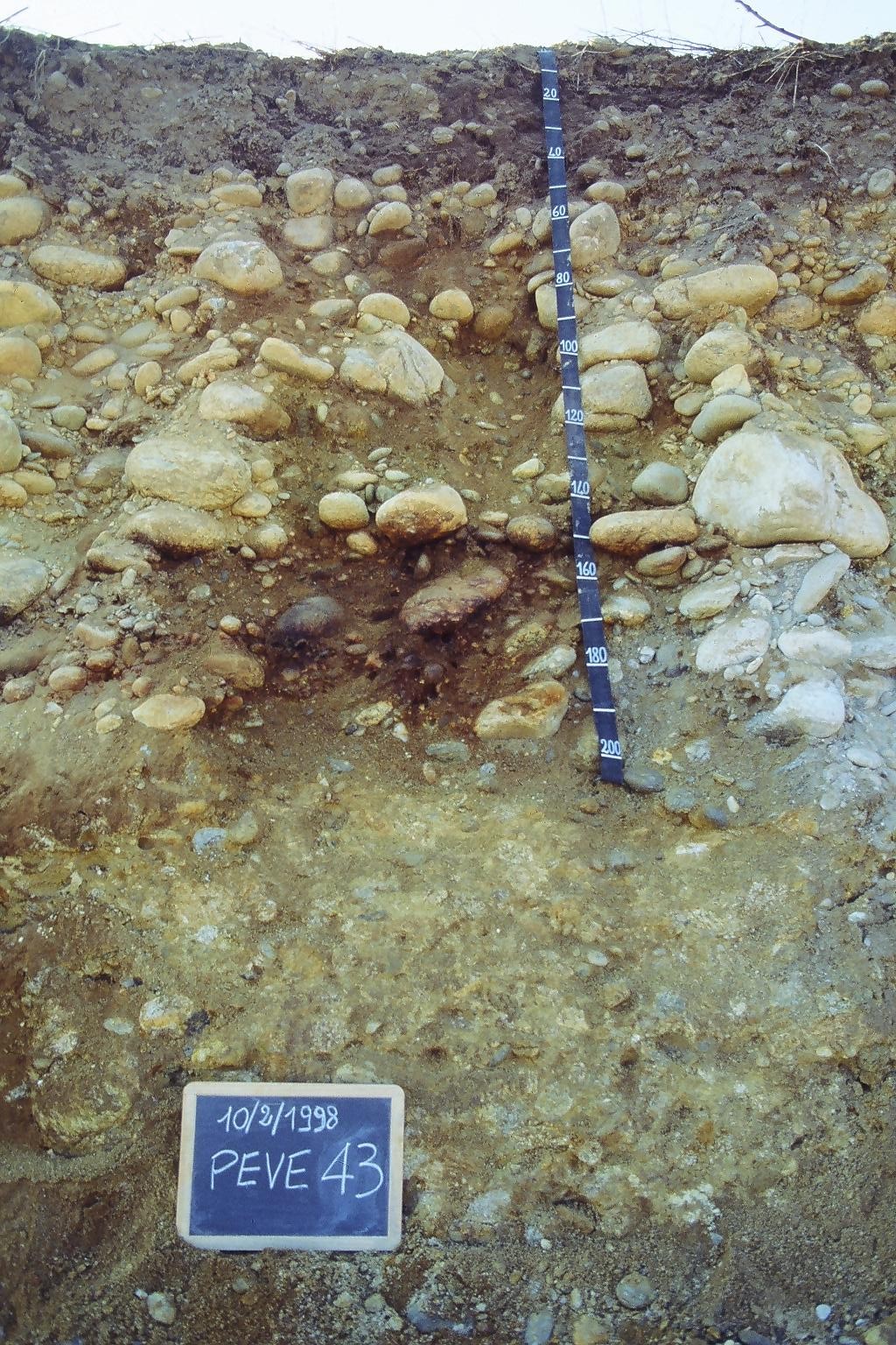 Orizzonte C : 190 - 250 cm; umido; tessitura sabbiosa; scheletro 70 % , di forma subarrotondata con diametro medio di 30 mm e diametro massimo di 150 mm, fortemente alterato; non calcareo; limite inferiore non raggiuto.