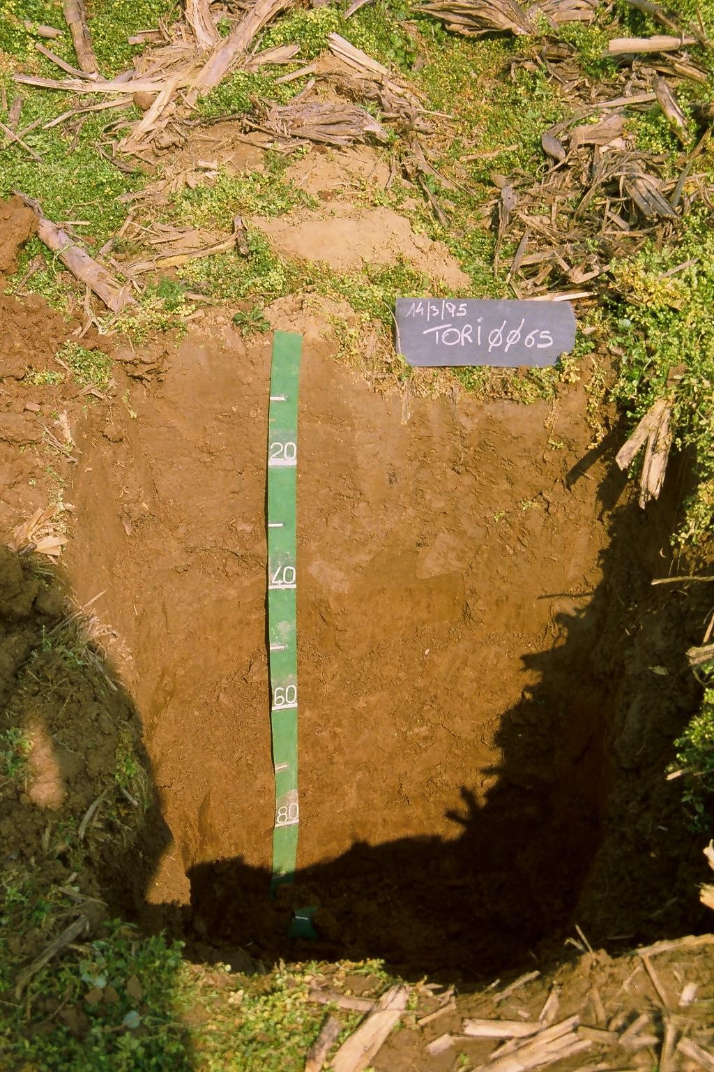 Il topsoil, con profondità attorno ai 50 cm si presenta di colore bruno, screziato di bruno-giallastro e con tessitura franca; Nel subsoil, il colore diventa bruno grigiastro scuro con evidenti glosse e abbondanti screziature bruno grigiastre; la tessitura è franco-limosa. Anche la struttura, evidente nella parte medio-alta del subsoil, diventa massiva in profondità. Concrezioni di Fe-Mn si osservano fin da 50 cm, ma questo fenomeno si manifesta in forma massiccia a partire da 80 cm di profondità.