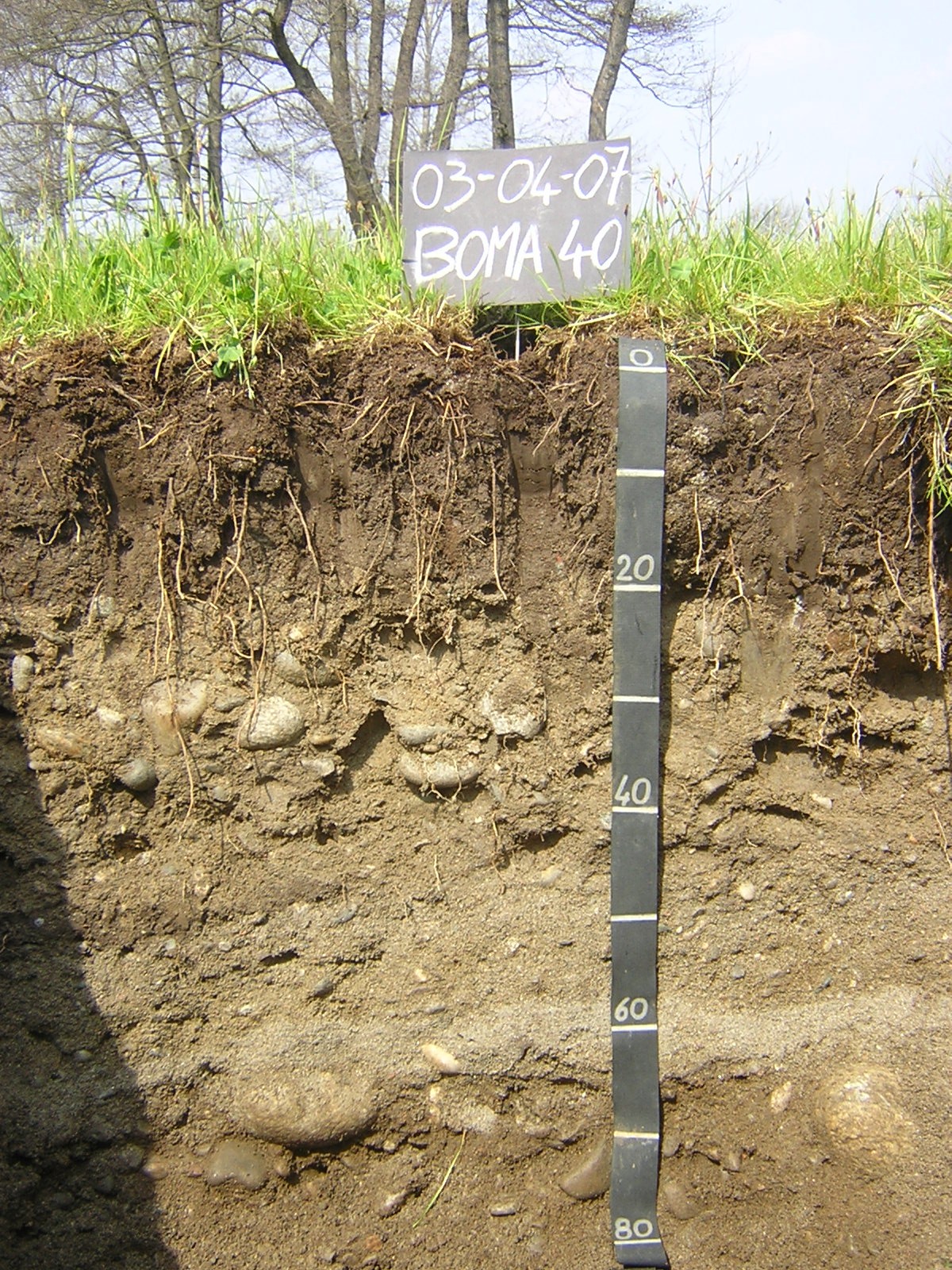 Orizzonte C2 : 75 - 90 cm; umido; colore grigio olivastro (5Y 4/2); tipo colore litocromico; tessitura sabbiosa; scheletro 60 % , di forma subarrotondata con diametro medio di 70 mm e diametro massimo di 200 mm, leggermente alterato; radicabilità 0 % ; resistenza: incoerente; cementazione molto debole; non adesivo; non plastico; non calcareo; limite inferiore non raggiuto.
